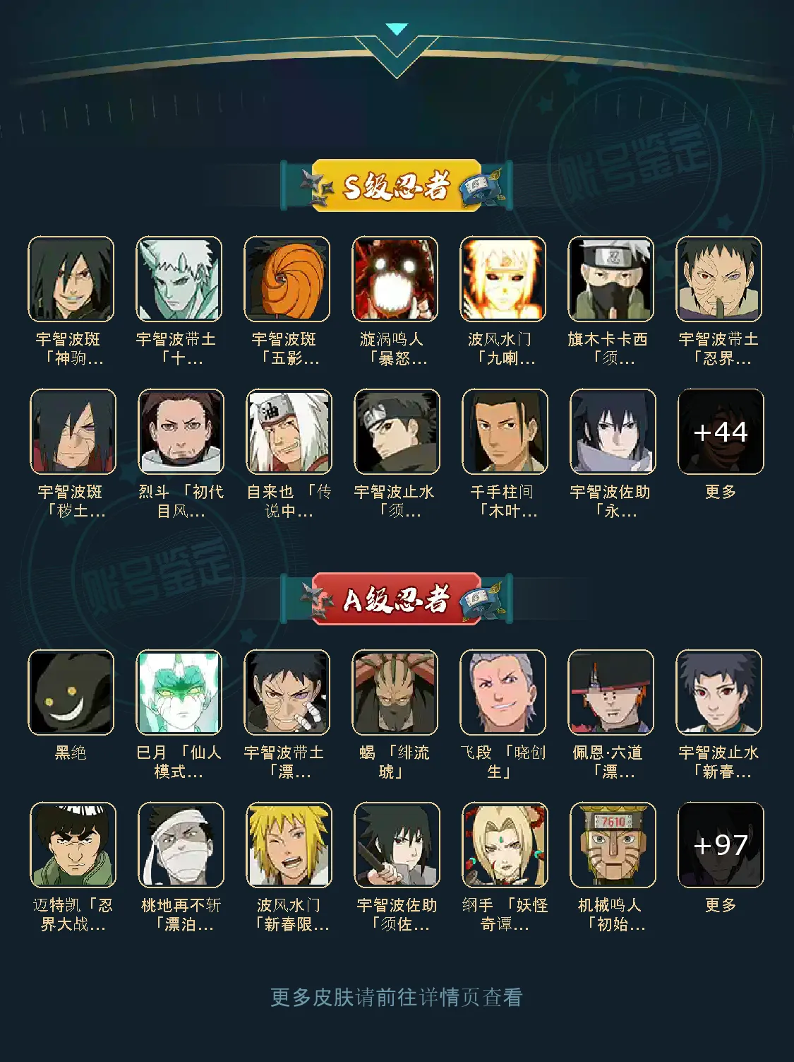 仙人自来也 纲手 波风水门 百战水门 猿飞日斩 千手柱间 宇智波斑 宇智波鼬 舞之自来也 大蛇丸 百战大蛇 秽土四代 秽土三代 秽土长门 仙人兜 黄猿九喇嘛鸣人 紫狗永恒佐助 樱婊忍战樱 秽土鼬 普通自来也 百豪纲手 死门凯 二代扉间 秽土二代 秽土初代 秽土柱间 白面具 须佐卡卡西 小胡子鬼灯幻月 雷影 土影 无 佩恩 百战佩恩 青年柱间 创立初代 秽土斑 青年斑 解斑 须佐止水 虎皮 破面带土 红夜带土 罗砂 秽土三代风影 忍战雷影 三代雷影 金角银角 秽土半藏 忍战大野木 小土豆 天道超 大筒木桃式 大筒木金式 钢铁之躯凯 桀骜之刃阿斯玛 狂野之鲨鬼鲛 飞段 黑飞段 百豪樱 忍战李 大卡卡西 五代水影照美冥 宇智波鼬 仙鸣 九尾查克拉鸣人 鹰佐 奇拉比 青年艾 半蛇兜 晓蛇 新春鼬 面麻 须佐佐助 疾风咒印佐助 忍战宁次 忍战天天 最终章雏田 幻容卡卡西 神卡 忍战卡卡西 泳装卡卡西 忍战凯 青春哥 惊门凯 爱情哥 新春止水 新春水门 青年水门 青水 新春我爱罗 泳装照美冥 侠隐照美冥 侠隐纲手 侠隐兜 漂泊再不斩 漂泊佩恩 漂泊二代 漂泊小南 漂泊佩恩 三船 青年三船 青年长门 泳装南 新春南 黑绝 新春大蛇丸 晓创生角度 晓创生蝎 晓创生飞段 泳装鼬 鲛肌融合鬼鲛 新春迪达拉 秽土迪达拉 恶灵之影飞段 暴怒带土 忍战黄土 卑留呼 桃博 黑土