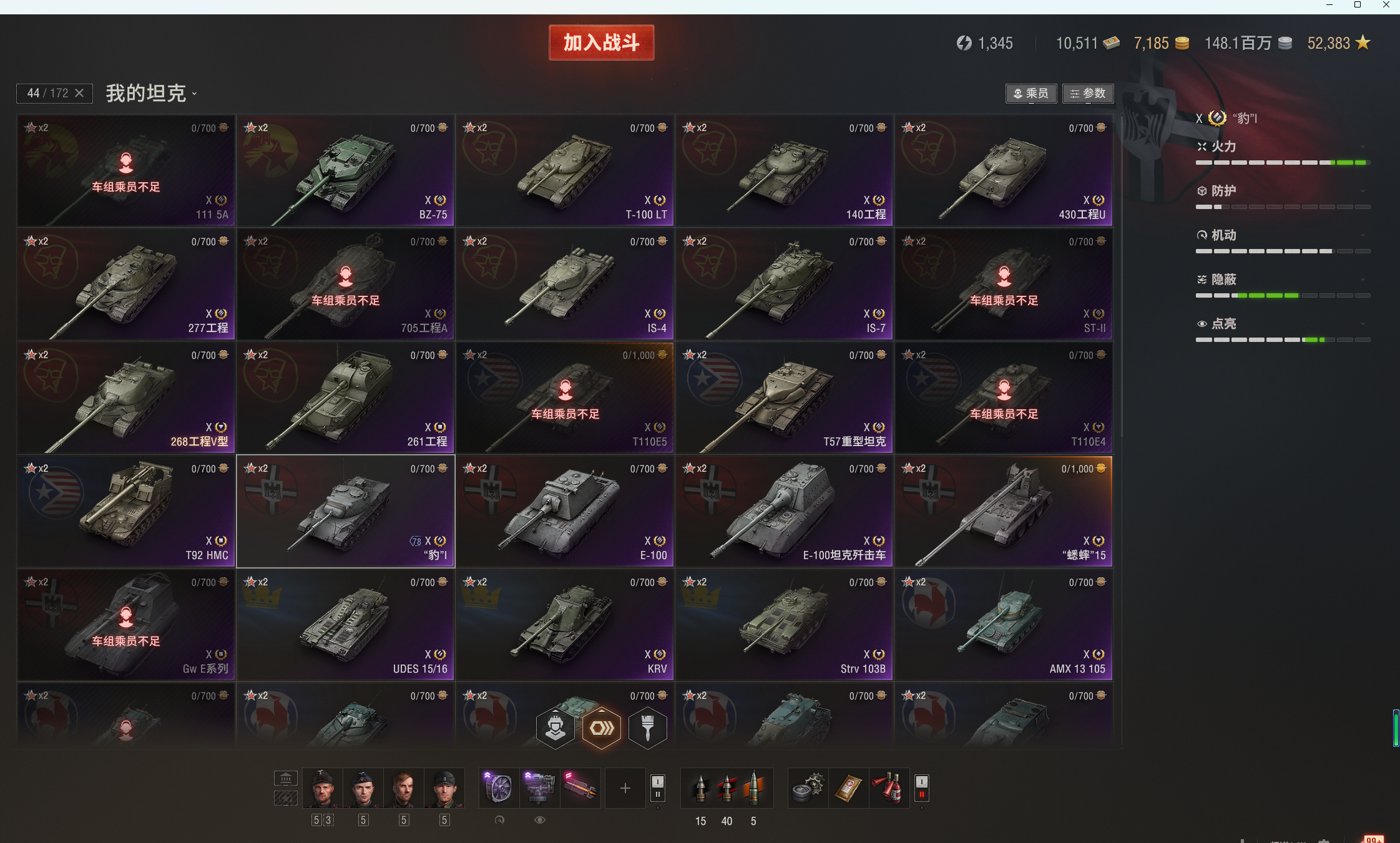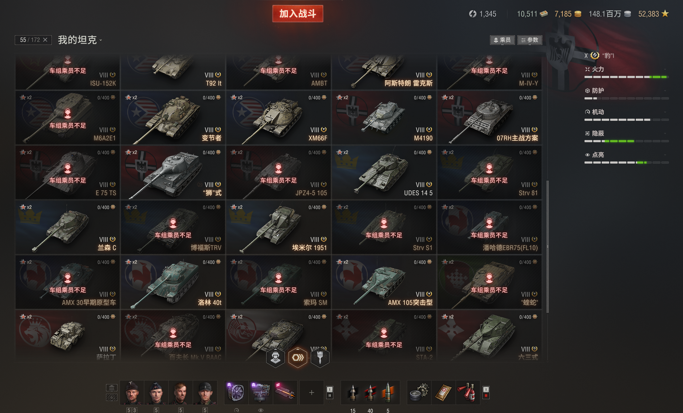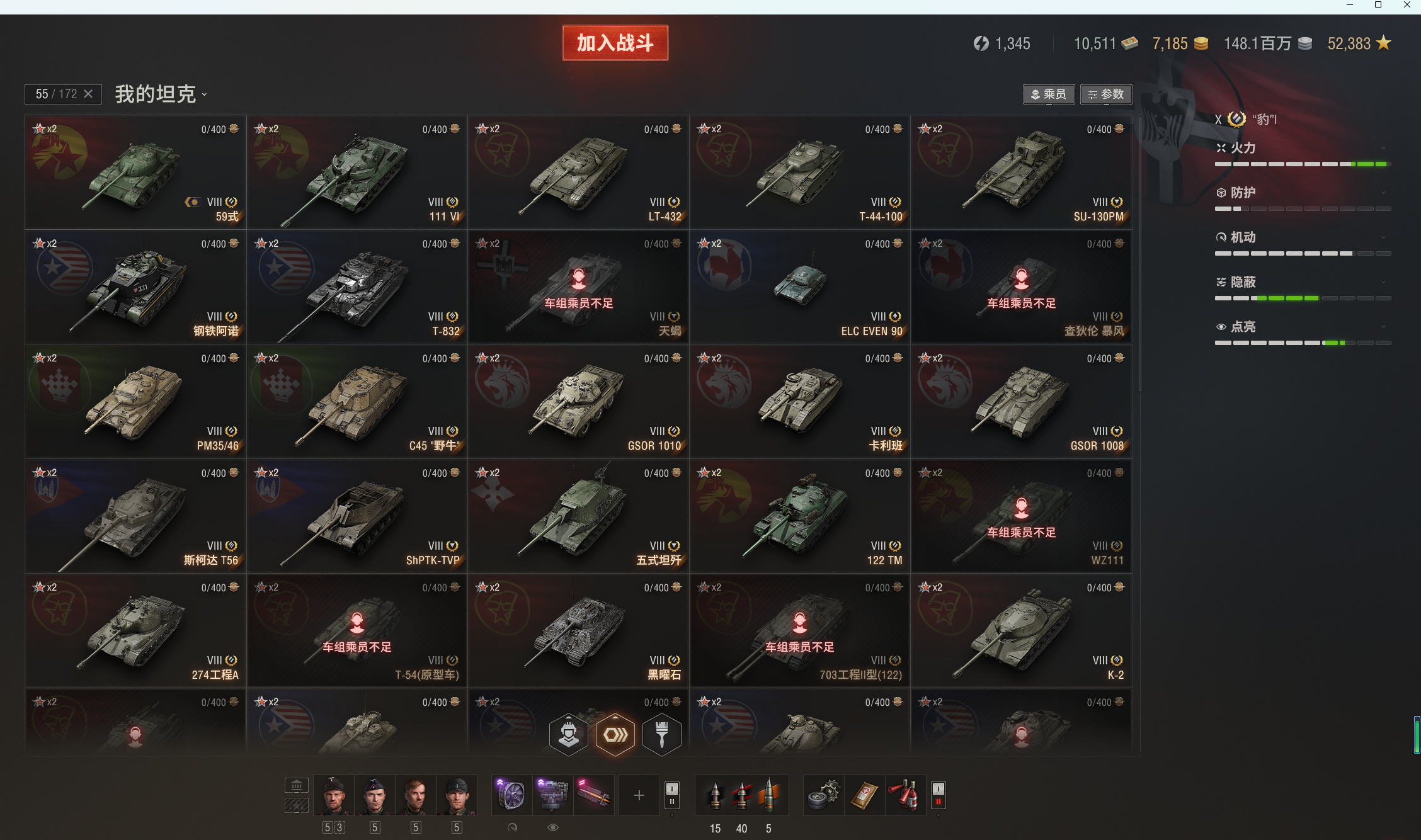 注意事项:1,进入游戏后,如果车辆情况不符。那是因为前面的玩家筛选了自己玩的坦克,其他的隐藏了。坦克显示栏,左下角小坦克标志,点进去把所有系别和级别选上,坦克就全部出来了。