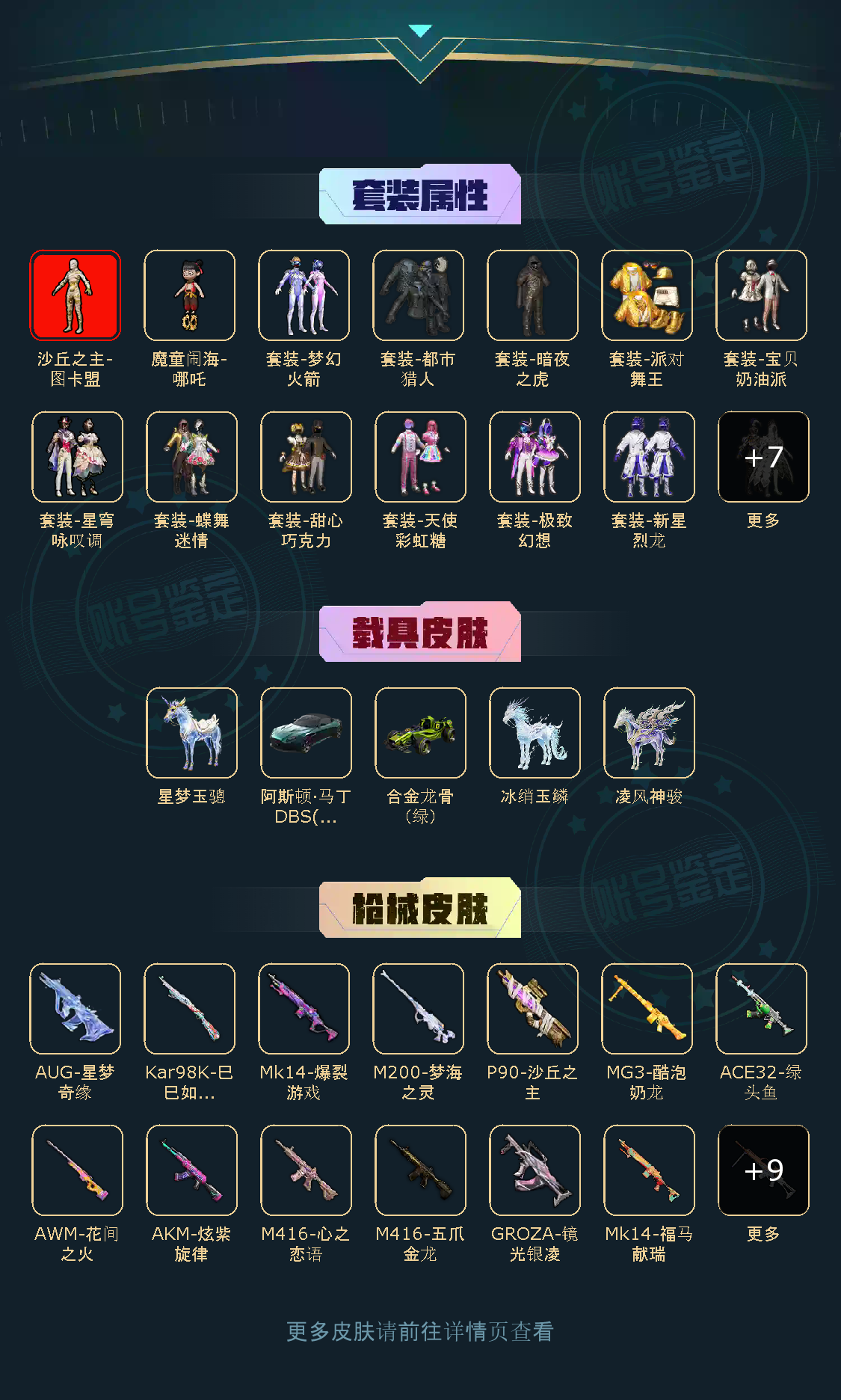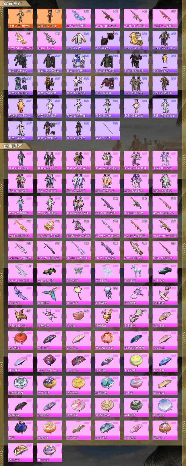 【稀有资产】沙丘之主-图卡盟[3级]/角色-魔童闹海-哪吒[1级]/AUG-星梦奇缘[9级]/M416-五爪金龙/M416-心之恋语/SCAR-L-魔童闹海 哪吒/GROZA-精灵之光/AUG-许七安/巡查员上衣/小恶魔头饰/套装-派对舞王/套装-深海小丑鱼/套装-都市猎人/套装-奇异狩猎者/套装-浪漫天命/套装-雪山精英/套装-暗影哥特/套装-龟仙人/套装-迅捷狂鲨/套装-浪漫波比/套装-纯白跃动/套装-攀登者/套装-东方飞龙/套装-时之沙漏/玩偶服-憨乐熊二/角色-粉雾星云/角色-都市丽猫/角色-许七安/角色-临安公主/角色-怀庆长公主/角色-海琴烟/套装-忍者信条/套装-浪客战士/撬棍-火尖枪