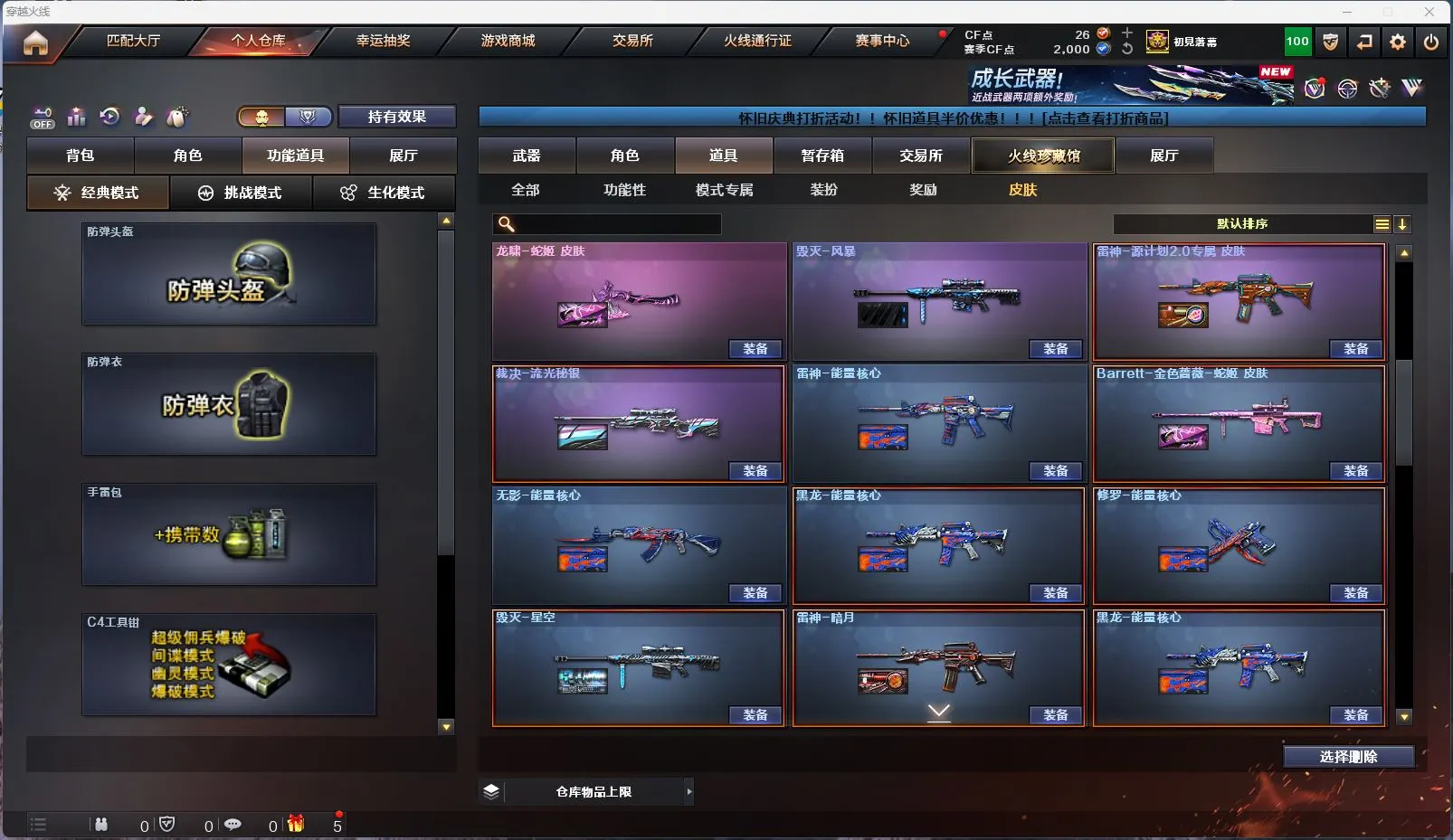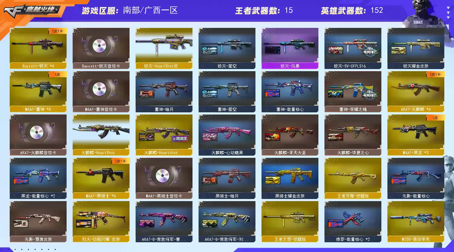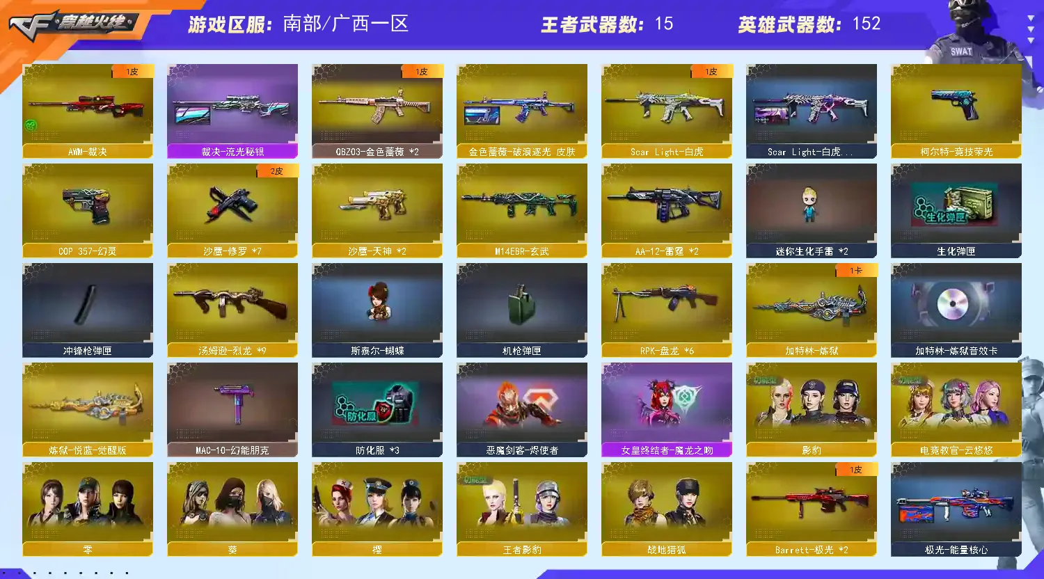 【M200幻神女团皮肤】【M200竞技荣光套装+4防云悠悠】【白虎+白虎暗星皮肤】【qbz03金色蔷薇+破浪逐光皮肤】【8烈龙+6盘龙+2炼狱+斯泰尔蝴蝶】【幻灵套装】【qbz191银翼】【王者雷影 王者芳薇 王者之魄 王者之圣 王者之武 王者之怒】【火麒麟+火麒麟音效卡+女团皮肤】【雷神+雷神音效卡+荣耀之魄皮肤】【6黑骑士+黑骑士音效卡】【毁灭+毁灭音效卡+CFPLS16冠军皮肤+女团皮肤】【裁决+流光秘银皮肤】【千变 黑龙 无影 死神 黑武士 天启 超新星 武圣 机械迷城 龙血 青龙 玄武 源雷神III 穹宇 玫瑰精灵 猎神 猩红传说 战士 战神 身先士卒 常胜将军 天龙 极光 巴雷特朱雀 巴雷特金色蔷薇 巴雷特暗月传说 AA12雷霆】——【沙鹰修罗*7 沙鹰天神*2 武圣 cop357幻灵 柯尔特竞技荣光】——【屠龙 龙啸 擎天 麒麟刺 尼泊尔雷霆 斩神刀雷暴 麒麟刺堕天神 龙啸堕天神 幻灵之锋 擎天竞技荣光 王者之啸】——【雷暴投掷武器套装*2 堕天神投掷武器套装*2 幻灵投掷武器套装*3 竞技荣光投掷武器套装*3】——【热门武器/小人枪】【M4A1赤狱骑士 AN91竞魂超新星 AWM昌龙 雷神小红 炫金火麒麟 炫金雷神 炫金千变 炫金武士 裁决雪莉杨 天龙曼陀罗 炫金毁灭】——【角色】【4防(云悠悠 影豹 王者影豹)】【葵 零 樱 战地猎狐】