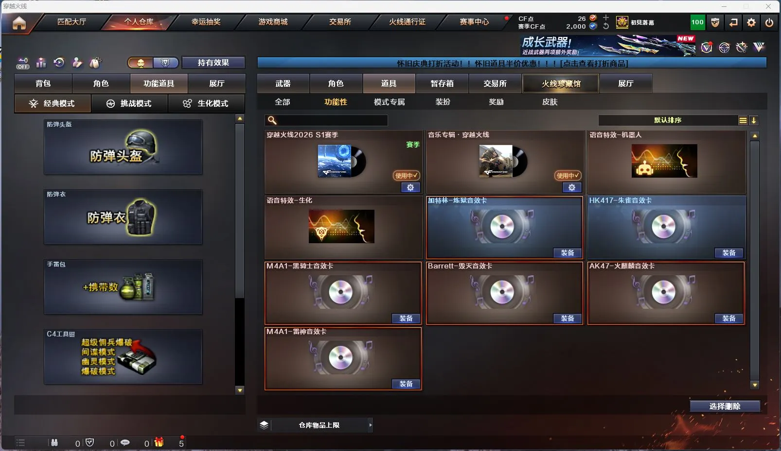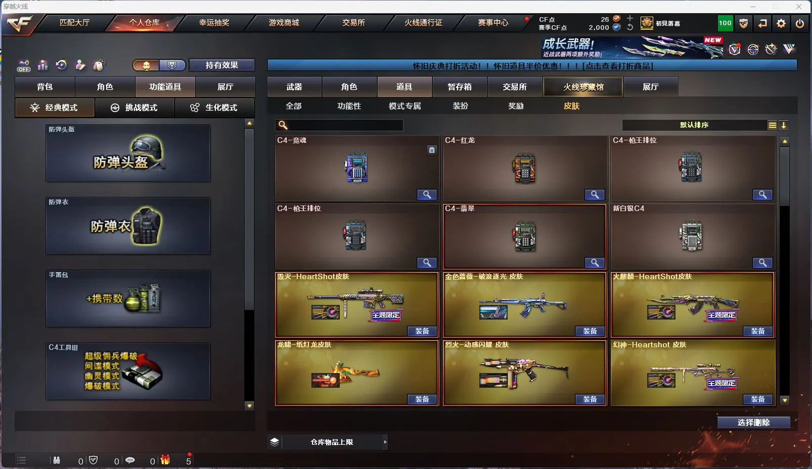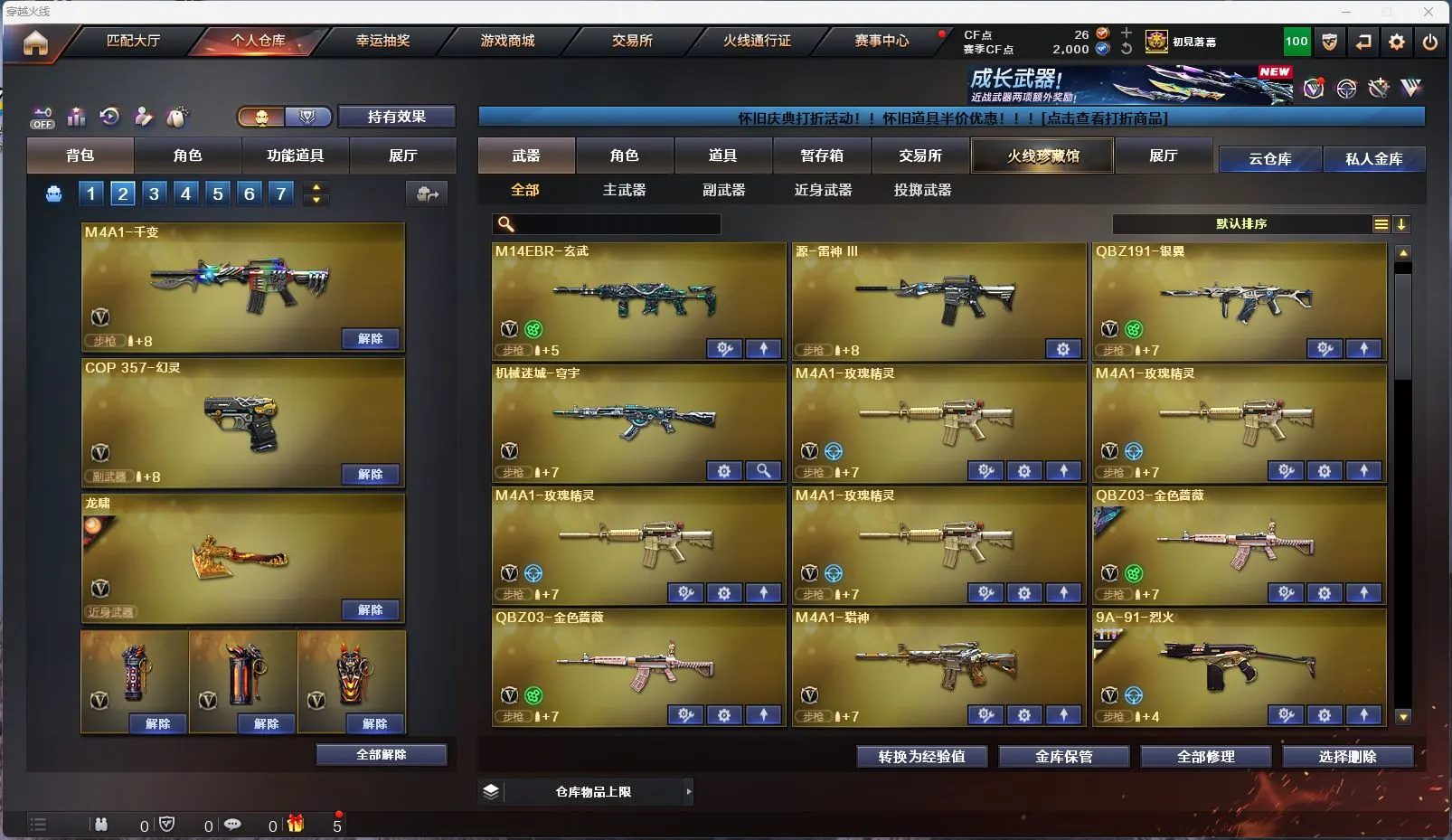 【M200幻神女团皮肤】【M200竞技荣光套装+4防云悠悠】【白虎+白虎暗星皮肤】【qbz03金色蔷薇+破浪逐光皮肤】【8烈龙+6盘龙+2炼狱+斯泰尔蝴蝶】【幻灵套装】【qbz191银翼】【王者雷影 王者芳薇 王者之魄 王者之圣 王者之武 王者之怒】【火麒麟+火麒麟音效卡+女团皮肤】【雷神+雷神音效卡+荣耀之魄皮肤】【6黑骑士+黑骑士音效卡】【毁灭+毁灭音效卡+CFPLS16冠军皮肤+女团皮肤】【裁决+流光秘银皮肤】【千变 黑龙 无影 死神 黑武士 天启 超新星 武圣 机械迷城 龙血 青龙 玄武 源雷神III 穹宇 玫瑰精灵 猎神 猩红传说 战士 战神 身先士卒 常胜将军 天龙 极光 巴雷特朱雀 巴雷特金色蔷薇 巴雷特暗月传说 AA12雷霆】——【沙鹰修罗*7 沙鹰天神*2 武圣 cop357幻灵 柯尔特竞技荣光】——【屠龙 龙啸 擎天 麒麟刺 尼泊尔雷霆 斩神刀雷暴 麒麟刺堕天神 龙啸堕天神 幻灵之锋 擎天竞技荣光 王者之啸】——【雷暴投掷武器套装*2 堕天神投掷武器套装*2 幻灵投掷武器套装*3 竞技荣光投掷武器套装*3】——【热门武器/小人枪】【M4A1赤狱骑士 AN91竞魂超新星 AWM昌龙 雷神小红 炫金火麒麟 炫金雷神 炫金千变 炫金武士 裁决雪莉杨 天龙曼陀罗 炫金毁灭】——【角色】【4防(云悠悠 影豹 王者影豹)】【葵 零 樱 战地猎狐】