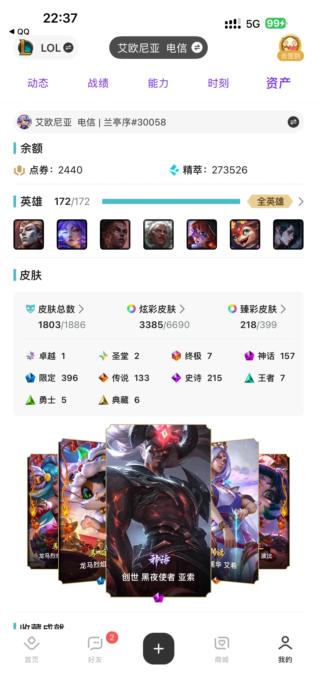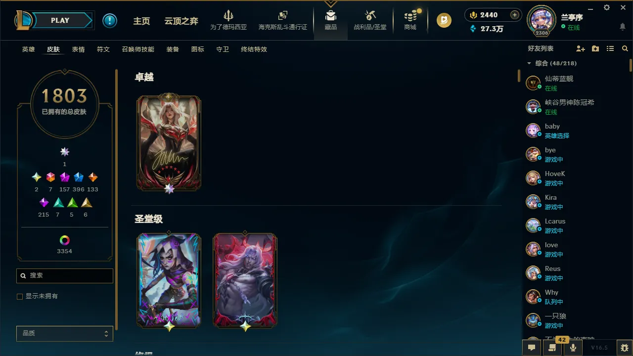 艾欧尼亚1803原皮,3353炫彩。218张臻彩。签名版阿狸,圣堂佛耶戈金克斯。10款神话幻想。157神话、396限定。冻结随时可协助解,24全天在。