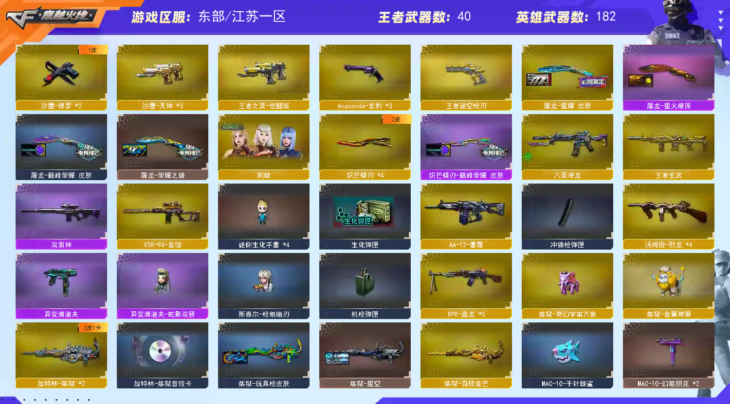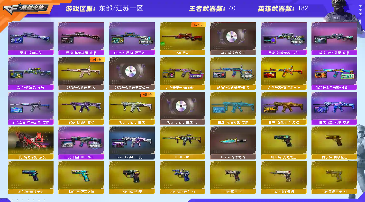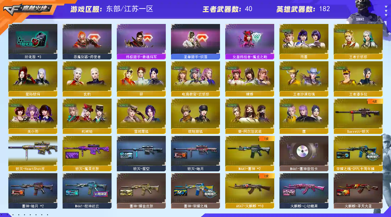 氪金天花板♥女帝神威艾莉莎星骇17传说双光海yzk9冥王手枪天花板奇幻泡泡象主流武器齐全3王者雷暴满配质量法玛斯天袭幻影❤️影煞最新金色狮子❤️4蝴蝶刀雷神十周年金色礼盒❤️此账号氪金20w+已登记虚拟资产备案恶意开挂导致被封索赔到底请勿以身试法 恶意撤单永久拉黑东部天花板满满图鉴满收藏满动物园生化皮肤全部都有