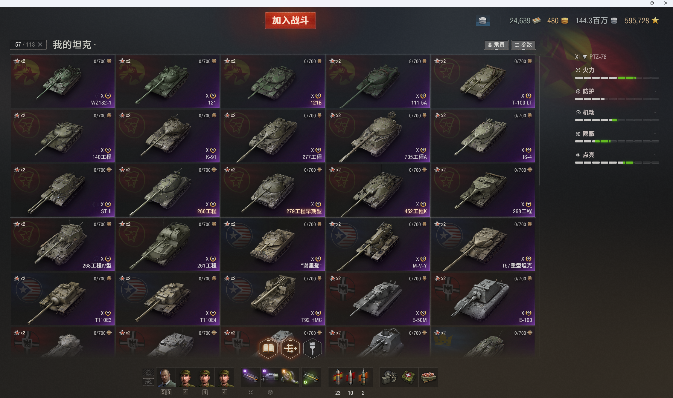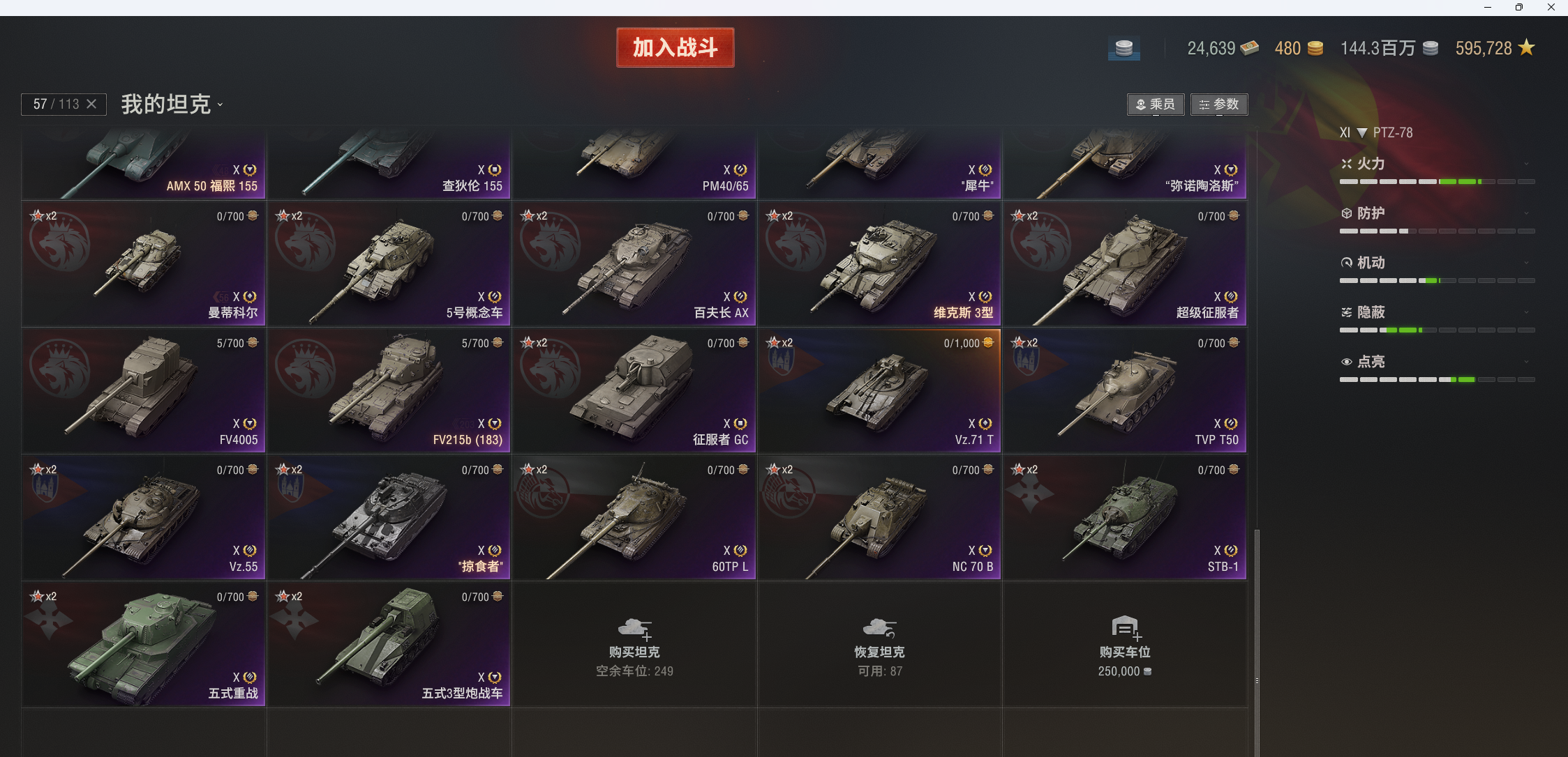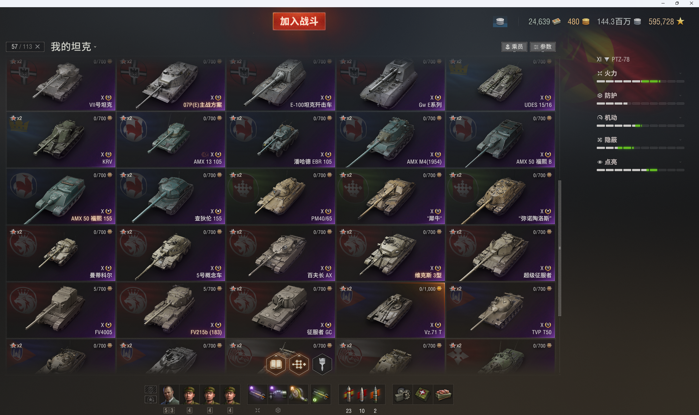 11级18台:Ares90c,STK-2,PTZ-78,BZ-79,KR-1,T803,豹120,鹿角虫,ASXX-40,谋划者,CS-67,432u,XM69,甲虫,囊鼠,strv-107,AMX67无双,破碎者。10级在库57台。10金:掠食者,279,编号452k,铲子豹,维克斯,260,183,121b等。9-8金31台:DZT-159,埃里希,H3,752 ,虎鼠,BZ-176。查理曼大帝,BZ-74-1等。