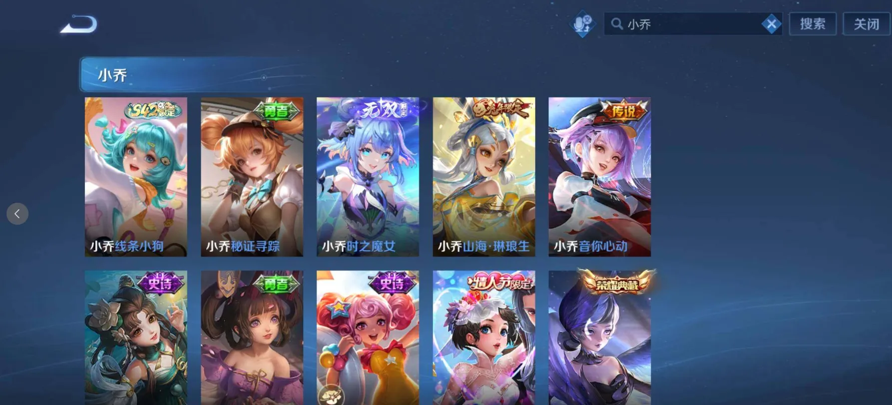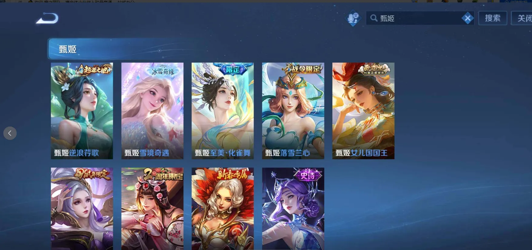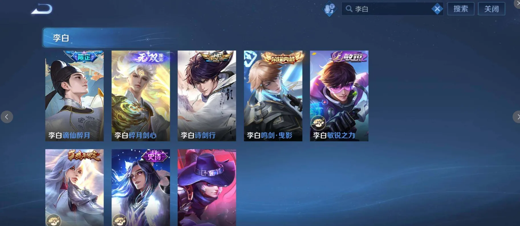 【限定皮肤】:白起狰,夏侯惇霜北刀,铠冥王哈迪斯,暃埋骨钱,蒙犽顽岩魄,蔡文姬夏日便利店,大乔绒语心约,虞姬夏日便利店,姜子牙天穹之誓,杨戬破阵退雄兵,李白谪仙醉月,狄仁杰阴阳师,小乔纯白花嫁,虞姬凯尔特女王,廉颇寅虎御盾,小乔山海琳琅生,赵云皇家上将,赵云引擎之心,赵云龙胆,赵云百木心枪,墨子神迹守卫,墨子降魔,妲己热情桑巴,妲己时之彼端,妲己时之奇旅,嬴政白昼王子,孙尚香蔷薇恋人,孙尚香异界灵契,鲁班七号狮舞东方,鲁班七号乒乒小将,鲁班七号寅虎瑞焰,鲁班七号时之奇旅,庄周云端筑梦师,庄周玄嵩,庄周高山流水,高渐离死亡摇滚,高渐离玩趣恶龙,阿轲迷踪丽影,钟无艳王者之锤,钟无艳超时空战士,孙膑妖精王,孙膑天狼运算者,孙膑寅虎展翼,扁鹊炼金王,扁鹊奇幻香踪,白起夜都怪侠,芈月重明,芈月白晶晶,芈月幻夜卜梦,吕布天魔缭乱,吕布猎兽之王,吕布御风骁将,吕布遇见神鼓,周瑜真爱至上,周瑜赤莲之焰,元歌云间偶戏,元歌无心,夏侯惇朔风刀,夏侯惇匿光决锋者,甄姬幽恒,甄姬女儿国国王,甄姬游园惊梦,甄姬落雪兰心,甄姬至美化雀舞,曹操烛龙,曹操天狼征服者,典韦岱宗,马可波罗逐梦之星,马可波罗暗影游猎,马可波罗深海之息,马可波罗山海玄木吟,马可波罗妄想实况,狄仁杰魔术师,狄仁杰万华元夜,狄仁杰神器狴犴令,达摩星际陆战队,达摩沙漠行僧,项羽海滩派对,项羽霸王别姬,项羽无限倾心,老夫子醍醐杖,老夫子航海奇遇记,关羽冰锋战神,关羽武圣,关羽百相守梦,貂蝉逐梦之音,貂蝉遇见胡旋,安琪拉魔法小厨娘,安琪拉追逃游戏,程咬金演武夺筹,露娜一生所爱,露娜启示之音,刘邦夺宝奇兵,韩信逐梦之影,韩信飞衡,韩信傲雪梅枪,王昭君凤凰于飞,王昭君午后时光,王昭君星穹之声,兰陵王默契交锋,兰陵王影龙天霄,兰陵王驯魔猎人,兰陵王金庭之子,花木兰青春决赛季,花木兰瑞麟志,花木兰默契交锋,花木兰燃星之曲,不知火舞绯月行,娜可露露前尘镜,橘右京枫霜尽,亚瑟潮玩骑士王,亚瑟追逃游戏,孙悟空美猴王,孙悟空至尊宝,孙悟空大圣娶亲,孙悟空零号赤焰,孙悟空孙行者,孙悟空齐天大圣,牛魔御旌,牛魔奔雷神使,后羿辉光之辰,后羿如梦令,后羿圣弓游侠,后羿无尽星芒,刘备百相守梦,张飞虎魄,张飞百相守梦,李元芳银河之约,李元芳匿光侦查者,李元芳云中旅人,虞姬霸王别姬,虞姬启明星使,虞姬无限倾心,钟馗神迹守卫,钟馗驱傩正仪,杨玉环遇见飞天,杨玉环寅虎心曲,杨戬永曜之星,杨戬潮玩骑兵,女娲朔望之晖,女娲补天,哪吒逐梦之翼,干将莫邪冰霜恋舞曲,干将莫邪真爱魔法,干将莫邪画中仙,雅典娜单词大作战,雅典娜黎明之约,蔡文姬奇迹圣诞,蔡文姬繁星吟游,太乙真人饕餮,太乙真人华丽摇滚,东皇太一逐梦之光,鬼谷子原初探秘者,鬼谷子五谷丰年,诸葛亮武陵仙君,诸葛亮时雨天司,诸葛亮鹤羽星尊,大乔白鹤梁神女,大乔挚爱花嫁,大乔时之奇旅,黄忠烈魂,黄忠火炮绅士,铠青龙志,苏烈玄武志,苏烈千军破阵,百里玄策白虎志,百里玄策原初追逐者,百里守约朱雀志,弈星混沌棋,梦奇顽趣,公孙离蜜橘之夏,公孙离祈雪灵祝,公孙离玉兔公主,沈梦溪星空之诺,沈梦溪大漠名商,沈梦溪匿光破解者,明世隐疑决卦,明世隐吟游魔法,裴擒虎天狼狩猎者,裴擒虎李小龙,裴擒虎寅虎赤拳,裴擒虎擒涛扼浪,狂铁电玩高手,米莱狄御霄,米莱狄胡桃异想国,瑶时之祈愿,瑶山海碧波行,云中君纤云弄巧,云中君时之祈愿,李信山海炽霜斩,伽罗太华,伽罗天狼溯光者,伽罗炽翼辉光,盾山御銮,盾山梦圆繁星,孙策挚爱之约,猪八戒西部大镖客,猪八戒猪悟能,上官婉儿梁祝,上官婉儿天狼绘梦者,上官婉儿神器万象笔,上官婉儿妄想奇谈,嫦娥如梦令,嫦娥拒霜思,嫦娥暖冬兔眠,曜李逍遥 ,曜山海苍雷引,西施玲珑珍味,西施至美乘鲤谣,蒙犽狂想玩偶喵,鲁班大师匿光启智者,鲁班大师探海日志,盘古冰霜神祇,镜匿光追影者,桑启海盐诗旅,夏洛特浮生妄,金蝉唐三藏,暃星界游侠,戈娅驭风魔法,艾琳女武神,艾琳流音漫舞,赵怀真鹤归松栖,云缨鹤归松栖,司空震地狱燃心,阿古朵江河有灵,张良古海寻踪,王昭君永恒水手月亮,狄仁杰夜礼服假面,蒙犽百解令,艾琳觅芳踪,蒙恬荣光圣徽,高渐离燃音魔法,妲己灵卜魔法,鬼谷子天穹祈灯,李白碎月剑心,伽罗琥珀纪元,铠琥珀纪元,马超琥珀纪元,姬小满妄想食味,小乔时之魔女,大乔乘龙忆丹青,安琪拉乘龙聚宝船,孙尚香乘龙问璇玑,孙策乘龙淬吴钩,赵云乘龙铭钟鼎,吕布曦玄引,貂蝉曦玄引,百里玄策超元猎域,亚连落雪白狼,沈梦溪龙舞盛年,曹操夜都魔契,鲁班七号蔬乡物语,李元芳蔬乡物语,海月金乌负日,刘邦剑破天穹,上官婉儿群星魔术团,程咬金群星魔术团,韩信群星魔术团,云中君群星魔术团,关羽决胜骁骑,镜青焰无极,项羽苍威无极,朵莉亚心动手记,海诺心动手记,刘备异域游侠,芈月浮光幕影,周瑜熔金海岸