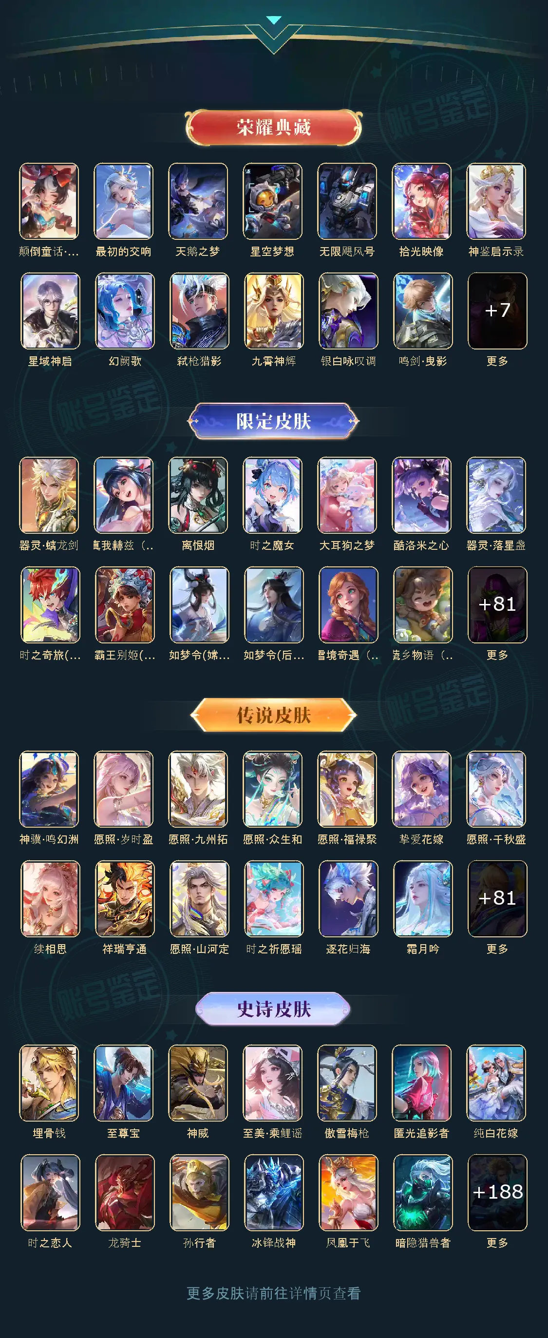 【荣耀典藏】:武则天英雄,孙悟空全息碎影,武则天倪克斯神谕,夏侯惇无限飓风号,小乔天鹅之梦,孙尚香杀手不太冷,鲁班七号星空梦想,芈月大秦宣太后,程咬金活力突击,李白鸣剑曳影,诸葛亮星域神启,花木兰九霄神辉,关羽赤影疾锋,铠银白咏叹调,貂蝉幻阙歌,韩信弑枪猎影,虞姬神鉴启示录,瑶拾光映像,伽罗最初的交响,吕布千魇归渊,安琪拉颠倒童话魔镜