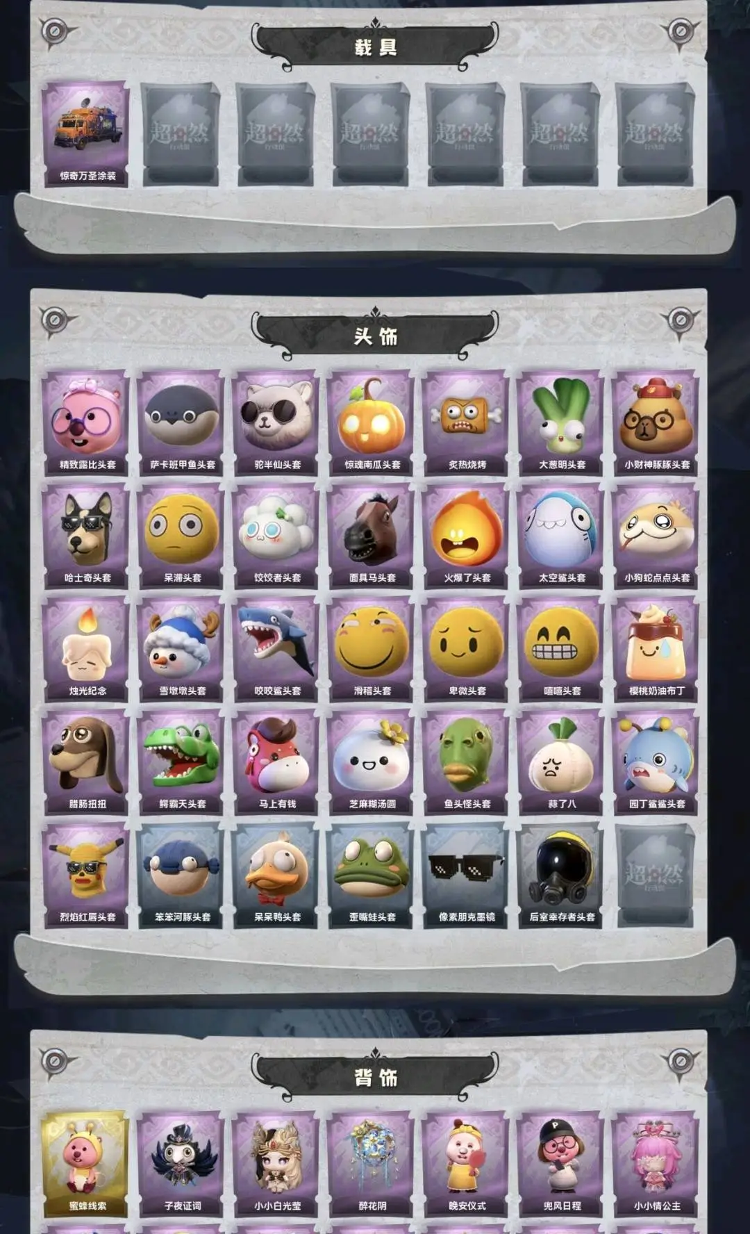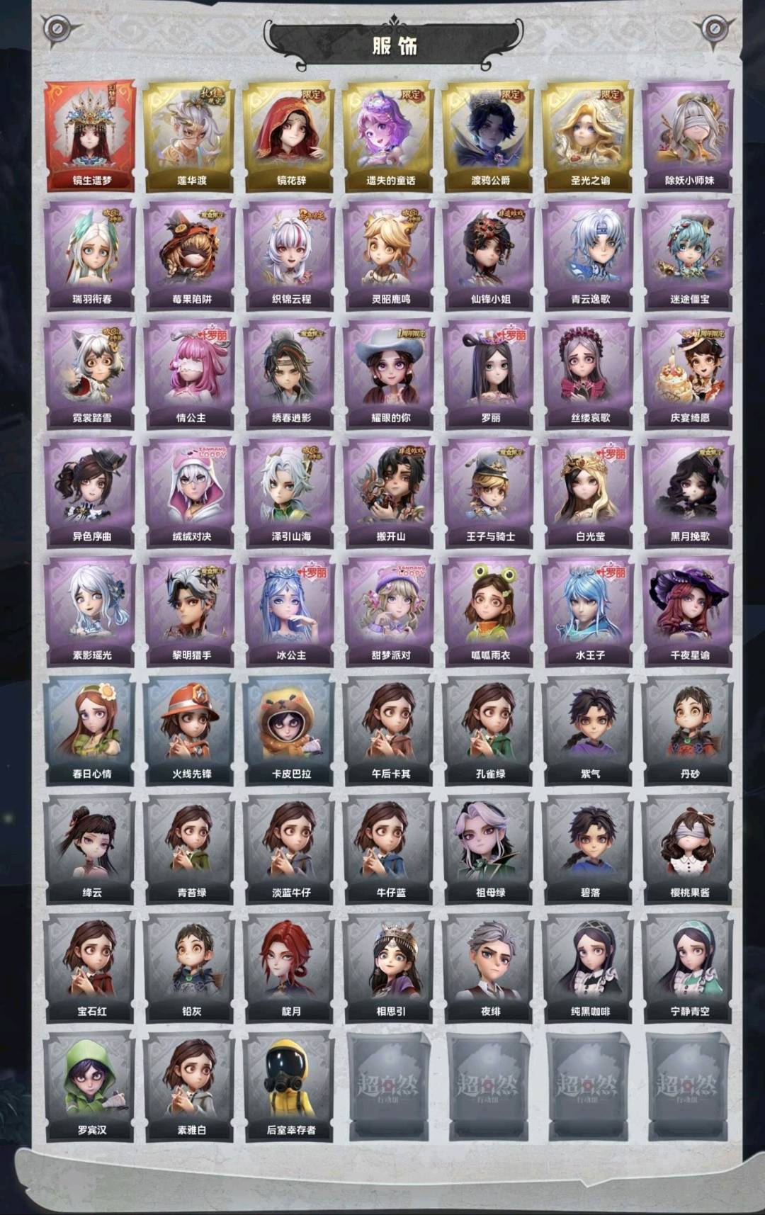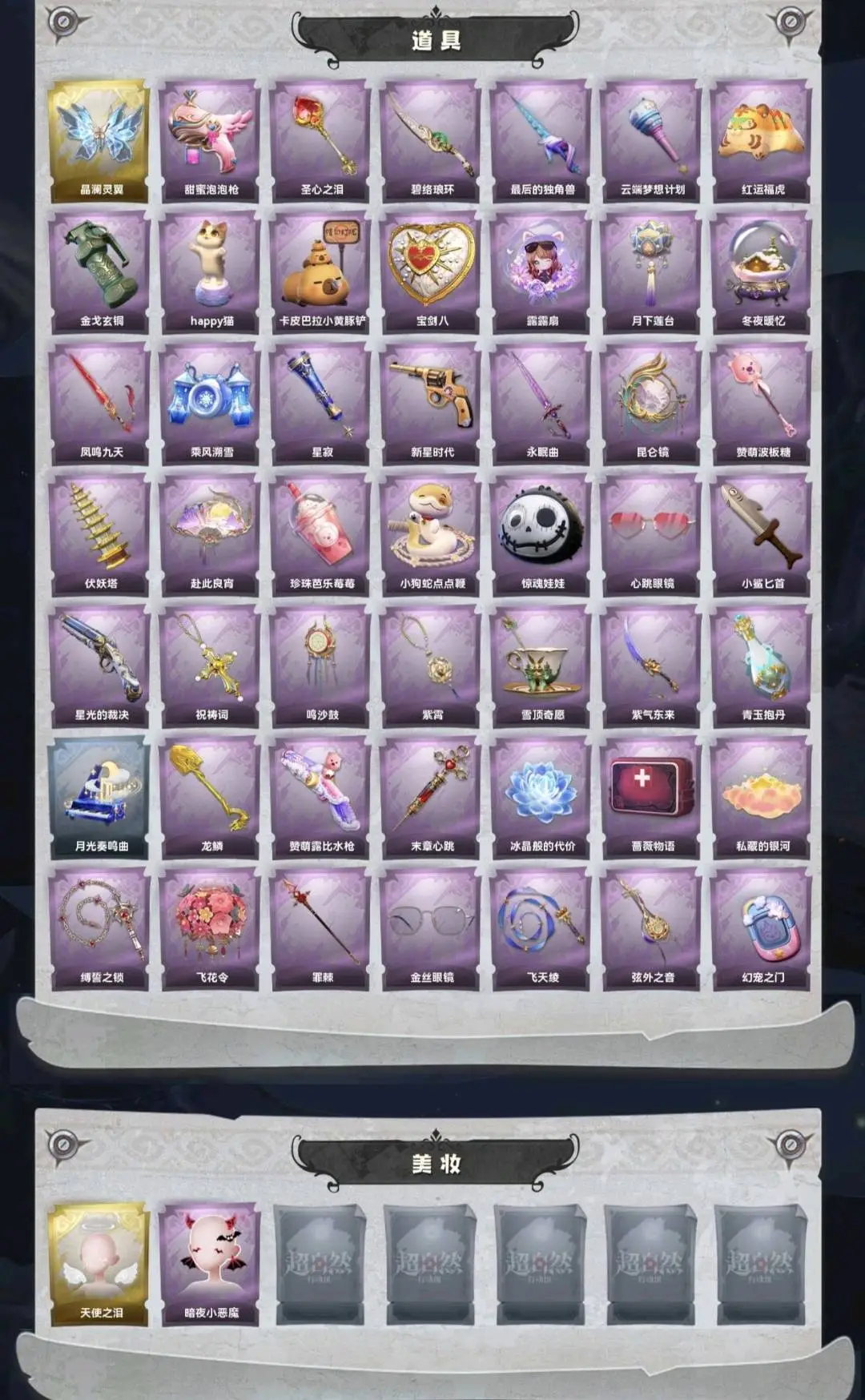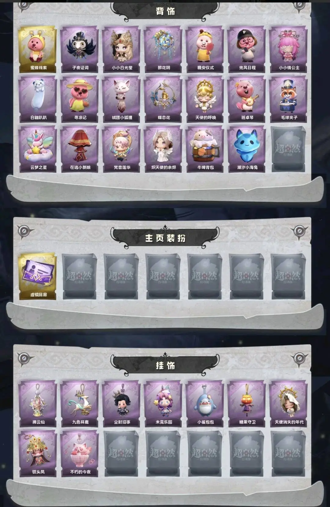 默认有二级密码,红皮1;金皮5;紫皮29;道具皮49;皮肤:巫铃儿-镜生遗梦,逍遥-莲华渡,巫铃儿-镜花辞,小黄-遗失的童话,零-渡鸦公爵,薇薇安-圣光之谕,莉莉-除妖小师妹,爱丽丝-瑞羽衔春,莉莉-莓果陷阱,临云-织锦云程,阿念-灵昭鹿鸣,薇薇安-仙锋小姐,零-青云逸歌,阿念-迷途僵宝,小黄-霓裳踏雪,莉莉-情公主,逍遥-绣春逍影,爱丽丝-耀眼的你,小黄-罗丽,爱丽丝-丝缕哀歌,阿念-庆宴绮愿,小黄-异色序曲,艾伦-绒绒对决,逍遥-泽引山海,零-搬开山,阿念-王子与骑士,薇薇安-白光莹,薇薇安-黑月挽歌,巫铃儿-素影瑶光,艾伦-黎明猎手,爱丽丝-冰公主,爱丽丝-甜梦派对,小黄-呱呱雨衣,艾伦-水王子,兰-千夜星谕;道具:喷气背包-晶澜灵翼,电击枪-甜蜜泡泡枪,铲子-圣心之泪,刺刀-碧络琅环,桃木剑-最后的独角兽,专业手电-云端梦想计划,腰包-红运福虎,闪光弹-金戈玄铜,音响-happy猫,铲子-卡皮巴拉小黄豚铲,腰包-宝剑八,折扇-露露扇,腰包-月下莲台,音响-冬夜暖忆,桃木剑-凤鸣九天,喷气背包-乘风溯雪,专业手电-星寂,转轮手枪-新星时代,桃木剑-永眠曲,传送按钮-昆仑镜,铲子-赞萌波板糖,葫芦-伏妖塔,折扇-赴此良宵,黄牛能量饮料-珍珠芭乐莓莓,长鞭-小狗蛇点点鞭,腰包-惊魂娃娃,夜视仪-心跳眼镜,刺刀-小鲨匕首,短管猎枪-星光的裁决,摸金符-祝祷词,音响-鸣沙鼓,摸金符-紫霄,黄牛能量饮料-雪顶奇愿,刺刀-紫气东来,黄牛能量饮料-青玉抱丹,音响-月光奏鸣曲,铲子-龙鳞,短管猎枪-赞萌露比水枪,急救包-末章心跳,除颤仪-冰晶般的代价,急救包-蔷薇物语,腰包-私藏的银河,长鞭-缚誓之锁,额外的背包-飞花令,长枪-罪棘,夜视仪-金丝眼镜,长鞭-飞天绫,除颤仪-弦外之音,传送按钮-幻宠之门;美妆:美妆-天使之泪,美妆-暗夜小恶魔;饰品:头饰-精致露比头套,头饰-萨卡班甲鱼头套,头饰-驼半仙头套,头饰-惊魂南瓜头套,头饰-炙热烧烤,头饰-大葱明头套,头饰-小财神豚豚头套,头饰-哈士奇头套,头饰-呆滞头套,头饰-饺饺者头套,头饰-面具马头套,头饰-火爆了头套,头饰-太空鲨头套,头饰-小狗蛇点点头套,头饰-烛光纪念,头饰-雪墩墩头套,头饰-咬咬鲨头套,头饰-滑稽头套,头饰-卑微头套,头饰-嘻嘻头套,头饰-樱桃奶油布丁,头饰-腊肠扭扭,头饰-鳄霸天头套,头饰-马上有钱,头饰-芝麻糊汤圆,头饰-鱼头怪头套,头饰-蒜了八,头饰-园丁鲨鲨头套,头饰-烈焰红唇头套,头饰-笨笨河豚头套,头饰-呆呆鸭头套,头饰-歪嘴蛙头套,头饰-像素朋克墨镜,头饰-后室幸存者头套,挂饰-拂云仙,挂饰-九色祥鹿,挂饰-尘封旧事,挂饰-未竟乐园,挂饰-小鲨包包,挂饰-糖果守卫,挂饰-天使消失的年代,挂饰-钗头凤,挂饰-不朽的今夜,背饰-蜜蜂线索,背饰-子夜证词,背饰-小小白光莹,背饰-醉花阴,背饰-晚安仪式,背饰-兜风日程,背饰-小小情公主,背饰-白鼬趴趴,背饰-寻凉记,背饰-绒团小狐狸,背饰-蝶恋花,背饰-天使的呼唤,背饰-班卓琴,背饰-毛球夹子,背饰-云梦之星,背饰-在逃小新娘,背饰-梵音莲华,背饰-炽天使的余烬,背饰-牛啤背包,背饰-潮汐小海兔;主页装扮:主页装扮-虚镜回廊;动作:动作-心跳摇,动作-刀马舞,动作-小雨摇,动作-知世摇,动作-舞台中心,动作-luvaboy,动作-九万字舞,动作-鸳鸯戏,动作-新年摇,动作-DL摇,动作-鞭子舞,动作-不孬摇,动作-老鼠舞,动作-青海摇,动作-鹏友摇,动作-来财舞,动作-萨克斯律动舞,动作-孤身摇,动作-胜利之舞,动作-sugar摇,动作-姬芽摇,动作-七仔摇,动作-伤心摇,动作-舞,动作-骑马舞,动作-抬手,动作-蝴蝶步,动作-要糖,动作-锤子舞,动作-山楂树之舞,动作-举牌,动作-人皇步,动作-旋转舞,动作-KT猫摇,动作-拜年,动作-带你逃跑吧,动作-律动迪斯科;工牌背景:工牌背景-卷珠帘,工牌背景-永恒之阶,工牌背景-绛缕衔云,工牌背景-童话扉页,工牌背景-佛系小豚,工牌背景-点点萌伴,工牌背景-圣光之誓,工牌背景-鸢尾花,工牌背景-情语塔,工牌背景-蓝海奇遇,工牌背景-冰晶宫,工牌背景-粉嫩小海狸,工牌背景-雷霆轩,工牌背景-复活的肖像,工牌背景-花蕾城堡,工牌背景-永夜巡礼,工牌背景-心同野鹤,工牌背景-流金照庭,工牌背景-水玲珑宫;工牌动作:工牌动作-轻躯鹤立,工牌动作-鸦影,工牌动作-净禅,工牌动作-春色盈怀,工牌动作-虔诚之姿,工牌动作-元气剪刀手,工牌动作-蜕变;员工:薇薇安,员工-爱丽丝,员工-逍遥,员工-爱德华,员工-兰,员工-巫铃儿,员工-小满,员工-临云,员工-艾伦,员工-零,员工-阿念,员工-小黄,员工-莉莉;累充9399元;铲铲币无
