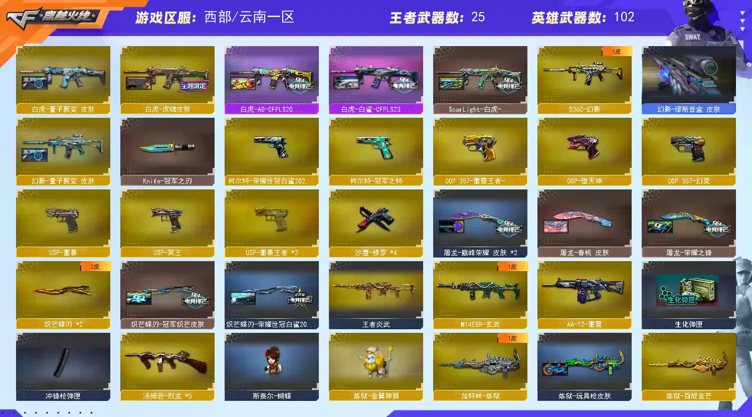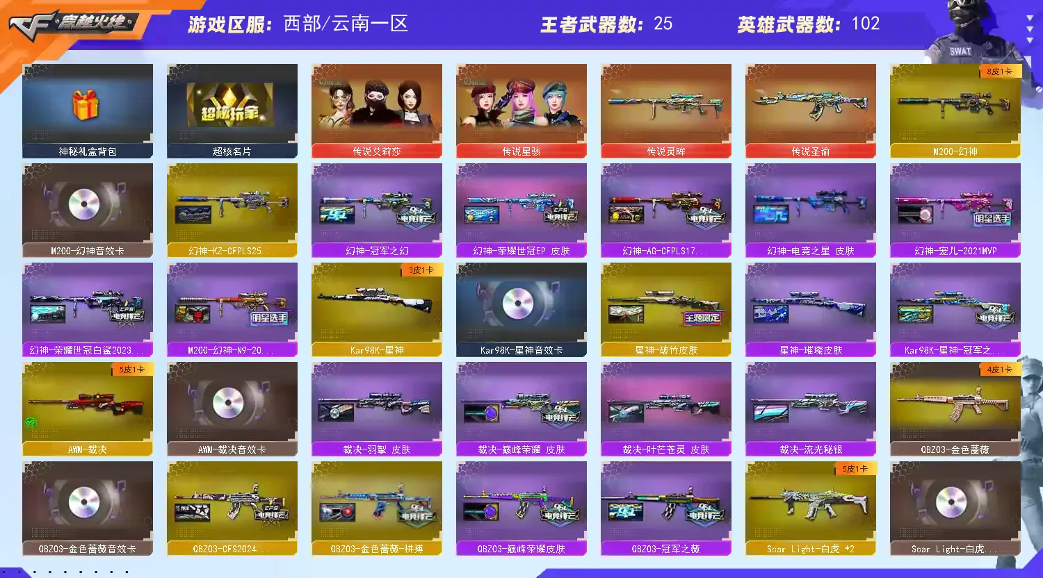 幻神三件套 Kar98K-星神三件套 裁决三件套 热门武器带皮带卡 生化5烈龙 Knife-冠军之刃 哔哩哔哩名片】【四防传说艾莉莎】【四防传说星骇】【传说灵眸】【M200-幻神+音效卡+幻神-宠儿+幻神-冠军之幻+幻神-AG-CFPLS17+幻神-荣耀世冠白鲨2023+kz25冠军+电竞之星】【Kar98K-星神+音效卡+破竹+星神-璀璨+Kar98K星神冠军之星】【王者幻神】【王者风神】【王者星霆】【传说圣谕】【G36C-幻影+量子聚变】【ScarLight-白虎+音效卡+虎啸+量子聚变+白鲨23冠军+冠军之虎】【QBZ03-金色蔷薇+音效卡】【生化 2炼狱 5烈龙 炼狱-金翼禅狮 炼狱-枪娘掣电 蝴蝶】【裁决+音效卡+叶芒苍灵+巅峰荣耀】【Barrett-毁灭+音效卡+heartshot】【AK47-火麒麟+传奇石头-横秒之巅】【黑龙】【M4A1-雷神+航星+heartshot+拼搏+雷神-宠儿+雷神-荣耀之魄】【黑骑士+音效卡】【王者之翼 王者之魄 王者霜心】【死神 hk417-朱雀+音效卡 玄武 玫瑰精灵】【15手枪 修罗*4 usp雷暴 cop堕天神 cop幻灵 usp冥王 柯尔特荣耀世冠白鲨2023 cop雷霆王者 冠军之特 usp雷暴王者*2】【20近战 屠龙*4 擎天 斩神刀雷暴 炽芒蝶刃蝴蝶刀 云龙扇 王者玉锋】【手雷 雷暴雷 云龙雷 玄豹 量子之心 雷暴王者】【四防 关小雨 鹰 岚兮儿 智 王者潘多拉 王者沙漠玫瑰 王者炫】【幻神音效卡 Kar98K-星神音效卡 裁决音效卡 Barrett-毁灭音效卡 qbz音效卡 黑骑士音效卡 ScarLight-白虎音效卡