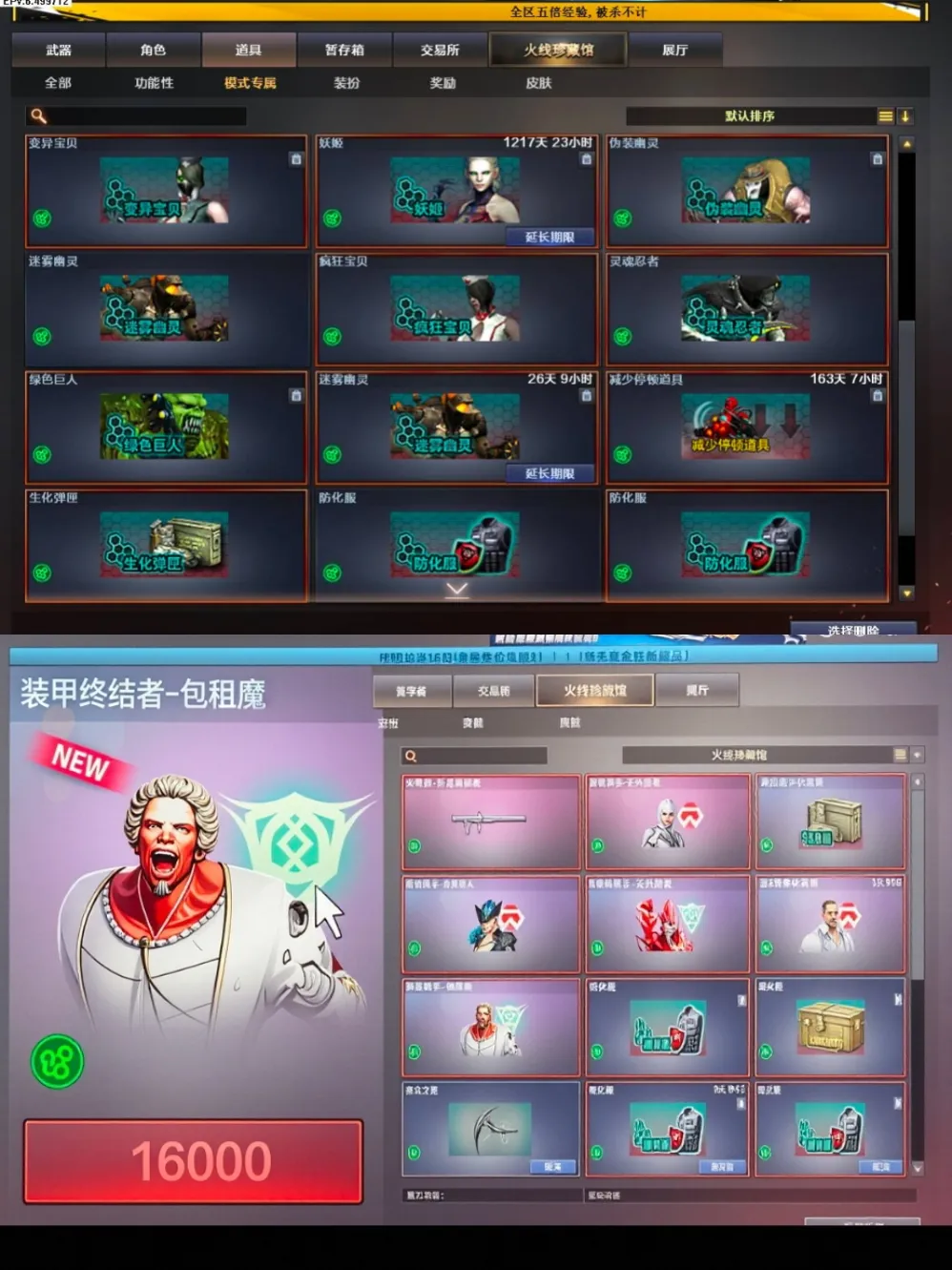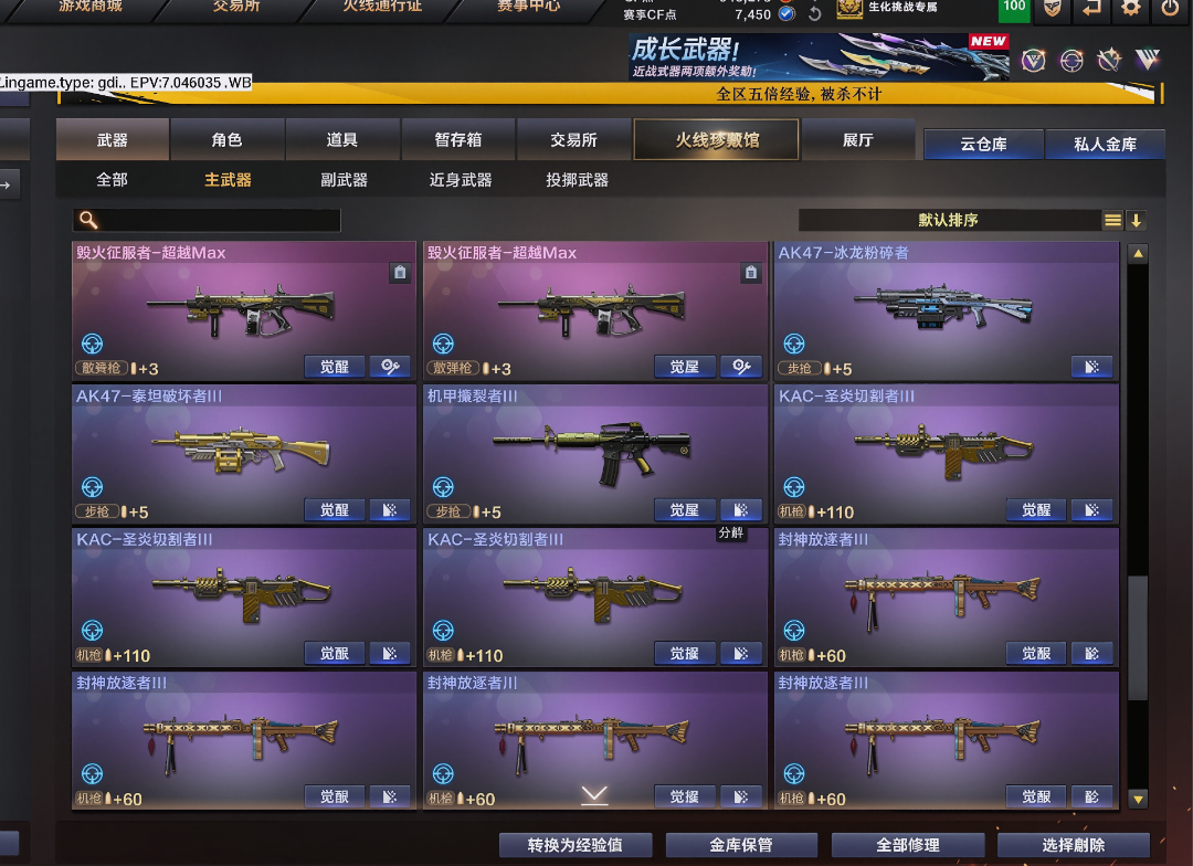 金翼禅狮炼狱 7盘、7烈 7白虎 1 斯太尔蝴蝶、2异变镇魔者 2异变清道夫、AA12雷霆、毒蜂,EVO赤血龙魂,全弹匣🈵➕所有道具钩子,等诸多生化神器,刷分/追击/守点/全通吃。