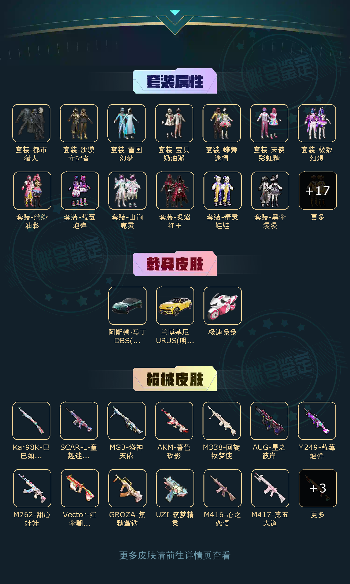 【稀有资产】套装-雪国幻梦/套装-缤纷油彩/M416-心之恋语/AUG-星之彼岸/AKM-梦之光华/角色-真理款战斗服/角色-薰款战斗服/角色-真嗣款战斗服/套装-都市猎人/套装-沙漠守护者/套装-胖达圆圆/套装-暗夜魅影/套装-粉红小猪/套装-萌熊伴侣/套装-浪漫天命/套装-潮萌小黄鸭/套装-雪山精英/套装-暗影哥特/套装-兔兔白日梦/套装-动感兔斯基人偶服/套装-狂沙舞者/套装-萌神柯基/套装-秘语星愿/套装-激萌罗小黑/玩偶服-美羊羊