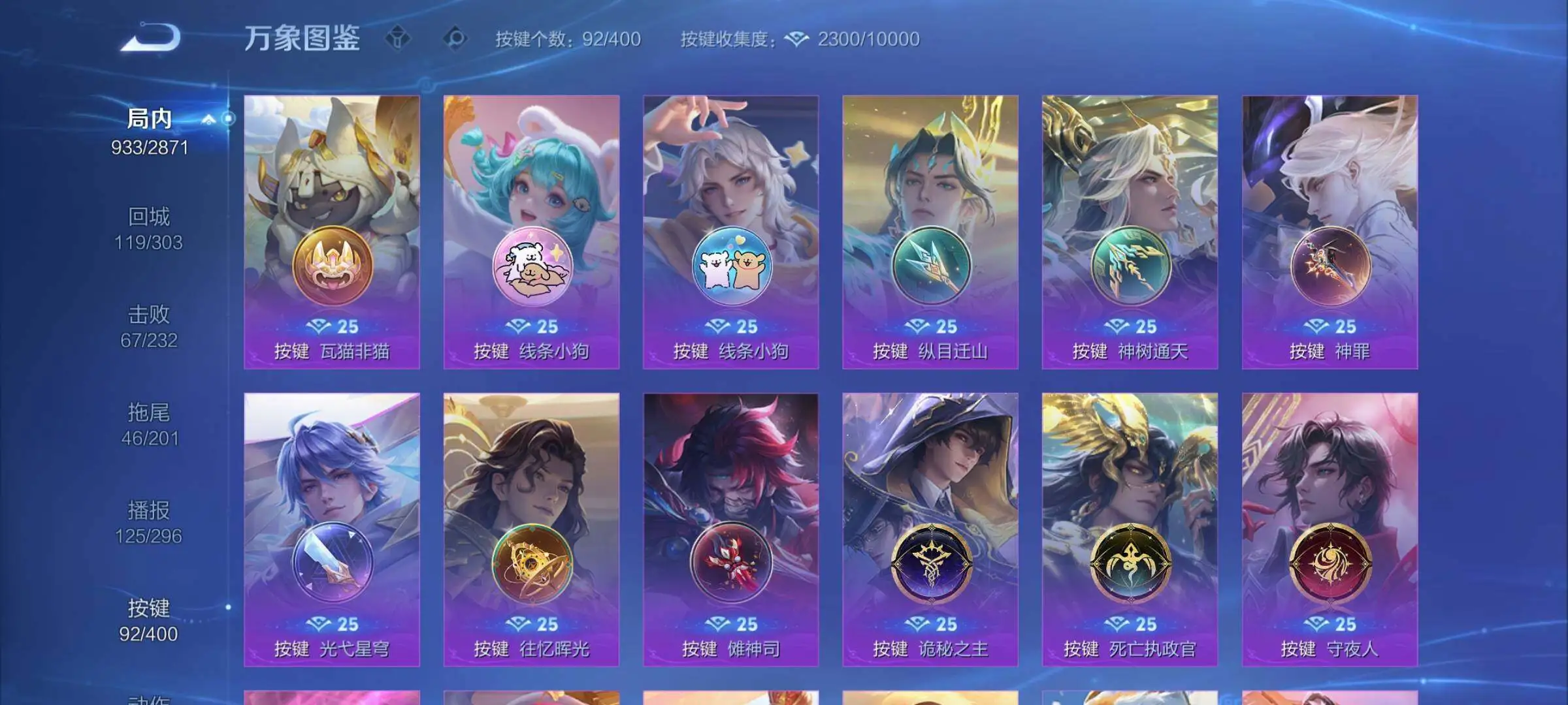 【战令限定】:嬴政白昼王子,吕布猎兽之王,典韦蓝屏警告,女娲朔望之晖,鲁班七号狮舞东方,钟馗神迹守卫,兰陵王驯魔猎人,周瑜赤莲之焰,李元芳银河之约,沈梦溪星空之诺,阿轲迷踪丽影,刘邦夺宝奇兵,马可波罗暗影游猎,猪八戒西部大镖客,蒙犽狂想玩偶喵,雅典娜单词大作战,元歌云间偶戏,亚瑟潮玩骑士王,米莱狄胡桃异想国,达摩星际陆战队,老夫子航海奇遇记,墨子神迹守卫,干将莫邪真爱魔法,后羿圣弓游侠,黄忠火炮绅士,芈月幻夜卜梦,明世隐吟游魔法,白起夜都怪侠,狂铁电玩高手,王昭君午后时光,钟无艳超时空战士,甄姬落雪兰心,暃星界游侠,嫦娥暖冬兔眠,扁鹊奇幻香踪,杨戬潮玩骑兵,戈娅驭风魔法,西施玲珑珍味,司空震地狱燃心,艾琳流音漫舞,高渐离燃音魔法,妲己灵卜魔法,鲁班七号蔬乡物语,李元芳蔬乡物语,镜青焰无极,项羽苍威无极,蔡文姬夏日便利店,虞姬夏日便利店,亚连破空之剑,廉颇撼地雄心,孙悟空神迹守卫,百里守约百相守梦,老夫子百相守梦,孙膑茶境仙,马超访茗客,刘禅鸭鸭历险记,沈梦溪鸭鸭历险记,周瑜百相守梦,孙策百相守梦,兰陵王傩神司,莱西奥光弋星穹,明世隐往忆晖光,周瑜线条小狗,小乔线条小狗