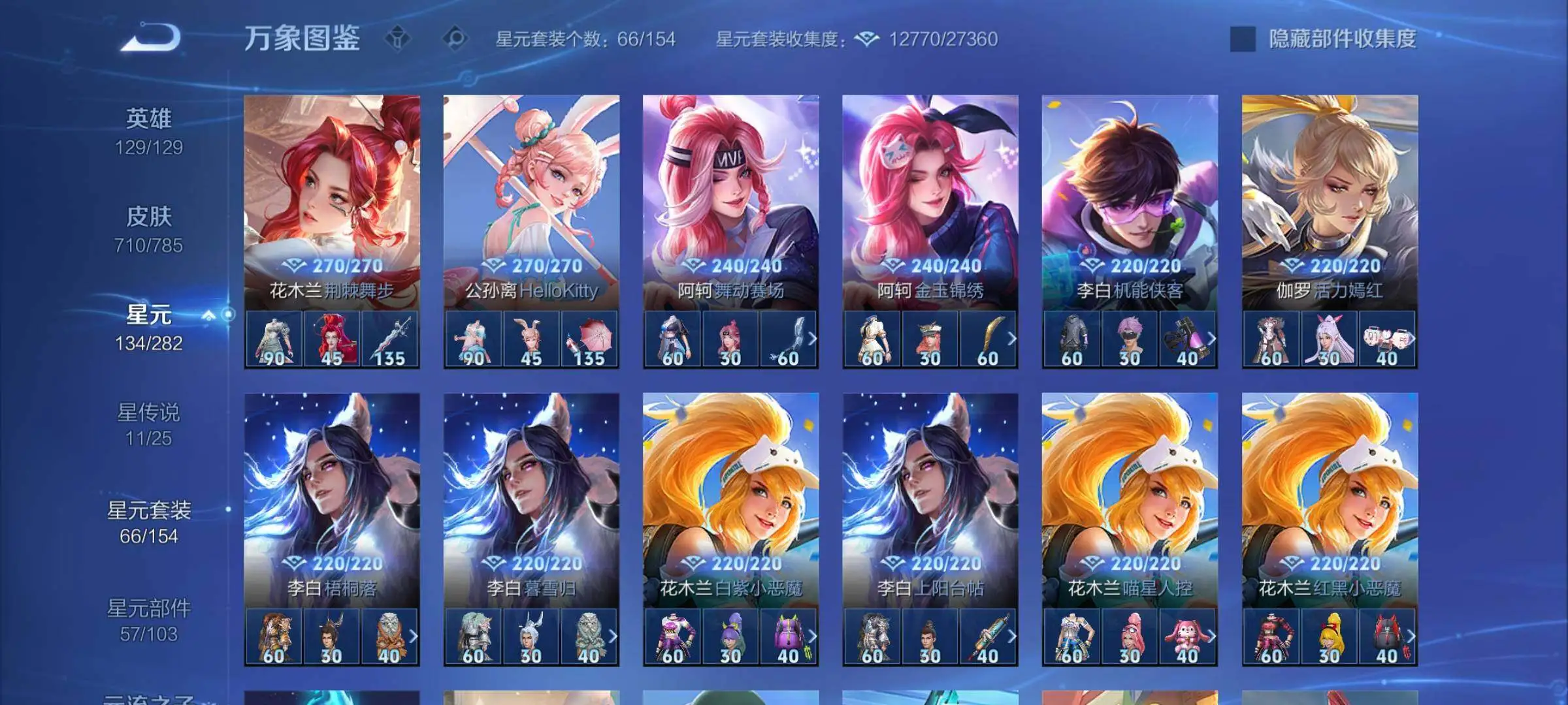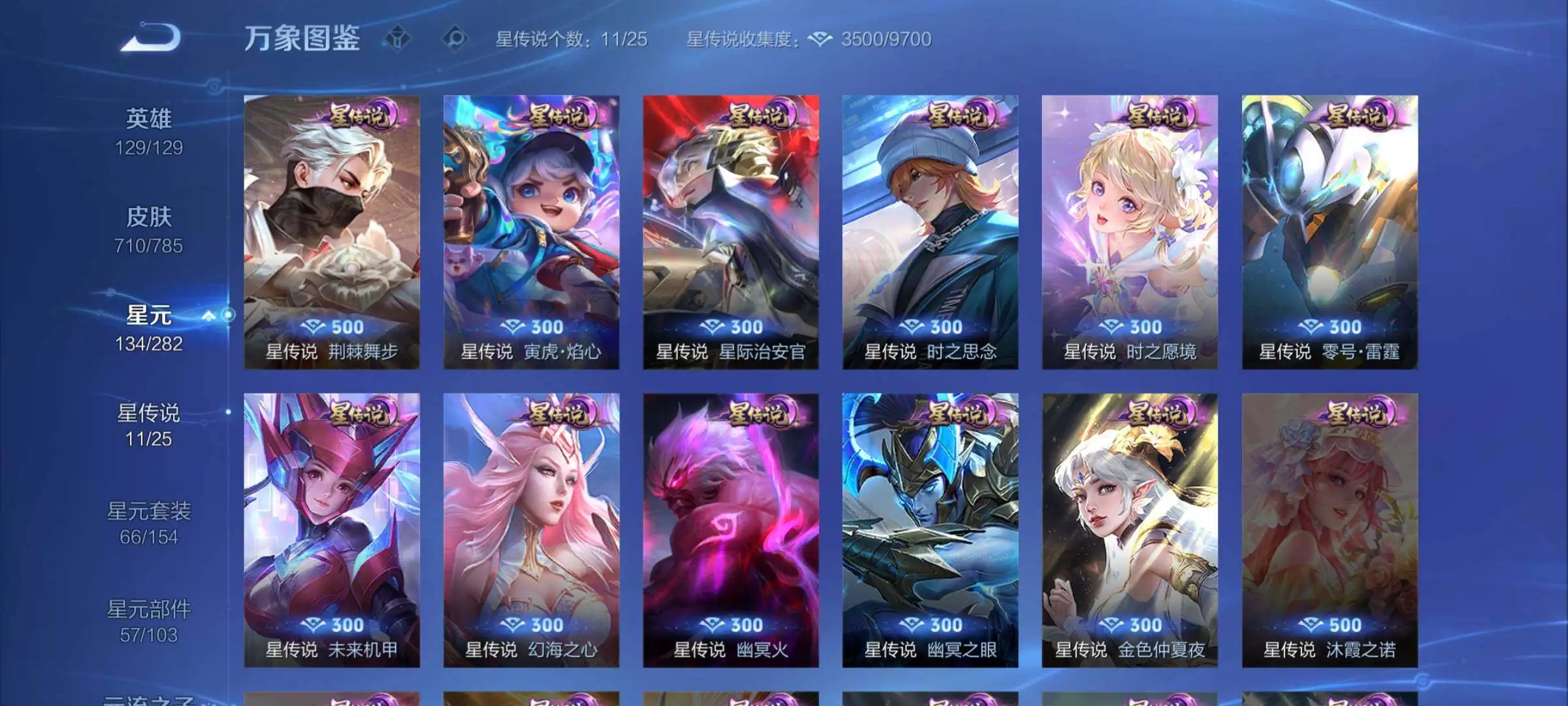 【荣耀典藏】:武则天英雄,孙悟空全息碎影,武则天倪克斯神谕,夏侯惇无限飓风号,小乔天鹅之梦,孙尚香杀手不太冷,鲁班七号星空梦想,芈月大秦宣太后,程咬金活力突击,李白鸣剑曳影,诸葛亮星域神启,花木兰九霄神辉,关羽赤影疾锋,铠银白咏叹调,韩信弑枪猎影,虞姬神鉴启示录,瑶拾光映像,伽罗最初的交响,吕布千魇归渊