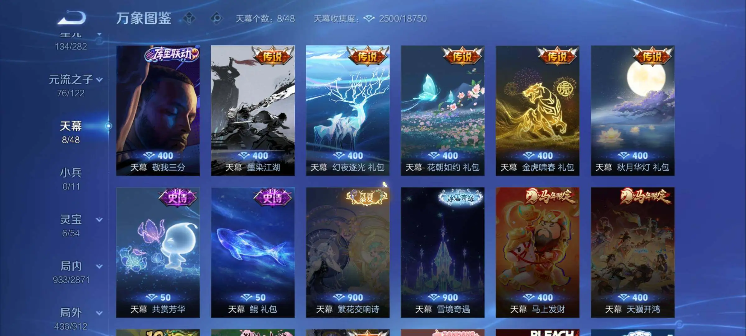 【天幕】:敬我三分天幕,墨染江湖天幕,幻夜逐光天幕,花朝如约天幕,金虎啸春天幕,秋月华灯天幕,共赏芳华天幕,鲲天幕