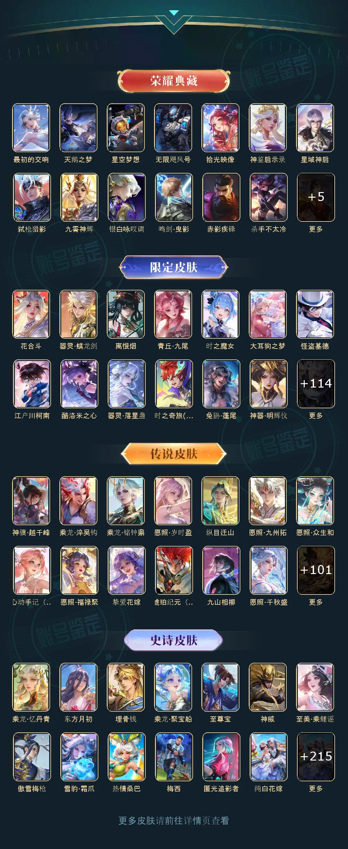 【年限皮肤】:孙悟空美猴王,王昭君凤凰于飞,李白凤求凰,杨戬永曜之星,后羿辉光之辰,花木兰瑞麟志,苏烈玄武志,百里玄策白虎志,百里守约朱雀志,铠青龙志,庄周玄嵩,甄姬幽恒,伽罗太华,典韦岱宗,韩信飞衡,公孙离祈雪灵祝,诸葛亮时雨天司,吕布御风骁将,牛魔奔雷神使,裴擒虎寅虎赤拳,鲁班七号寅虎瑞焰,孙膑寅虎展翼,廉颇寅虎御盾,杨玉环寅虎心曲,小乔山海琳琅生,曜山海苍雷引,李信山海炽霜斩,瑶山海碧波行,马可波罗山海玄木吟,孙尚香乘龙问璇玑,孙策乘龙淬吴钩,赵云乘龙铭钟鼎,大乔乘龙忆丹青,安琪拉乘龙聚宝船,司空震愿照山河定,女娲愿照千秋盛,妲己愿照众生和,澜愿照九州拓,蔡文姬愿照福禄聚,虞姬愿照岁时盈