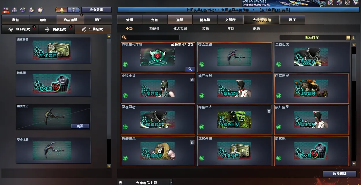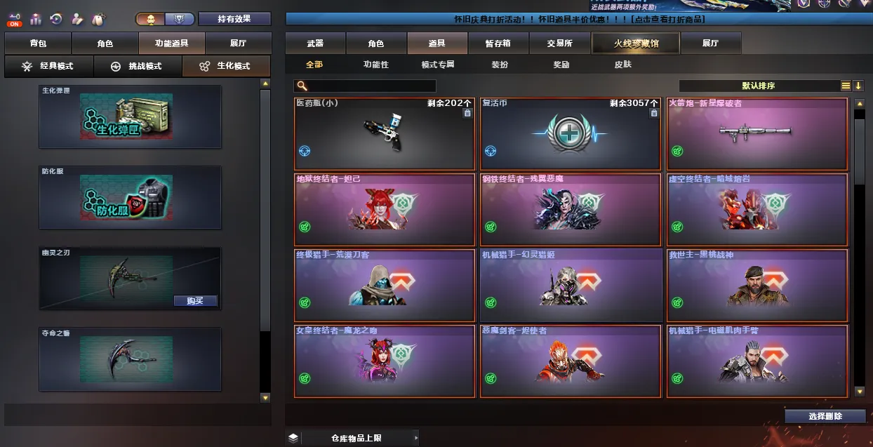 其他道具:C4-枪王排位蓝、C4-皮肤1、手雷包、防弹衣、防弹头盔、C4工具钳、超级对讲机、烟雾保护头盔-化蛇、烟雾保护头盔-粉猫儿、天使之翼