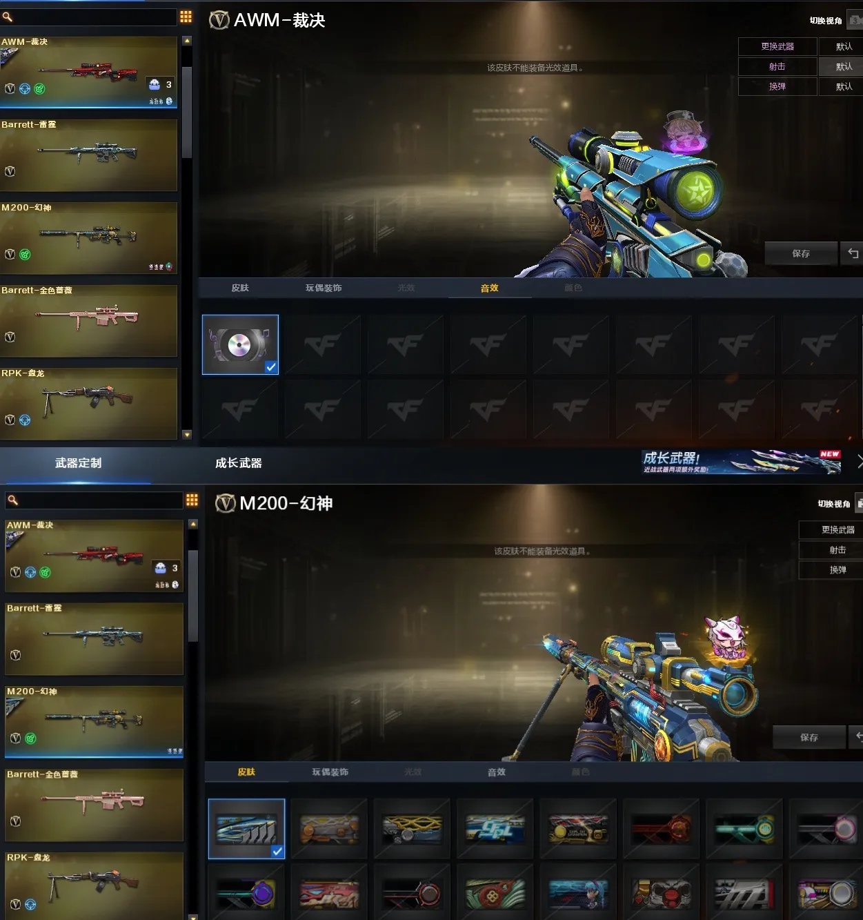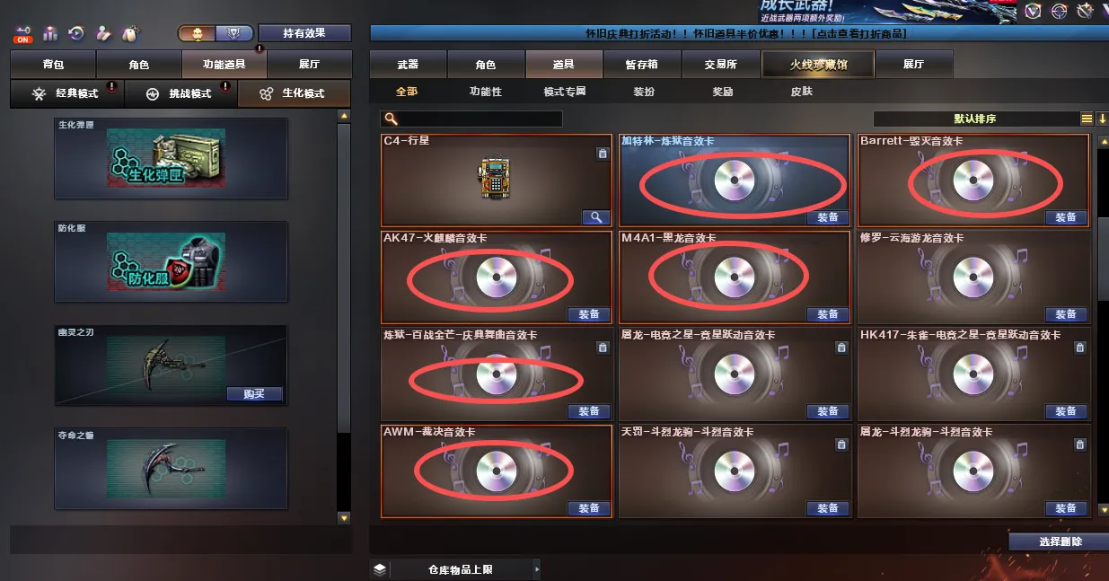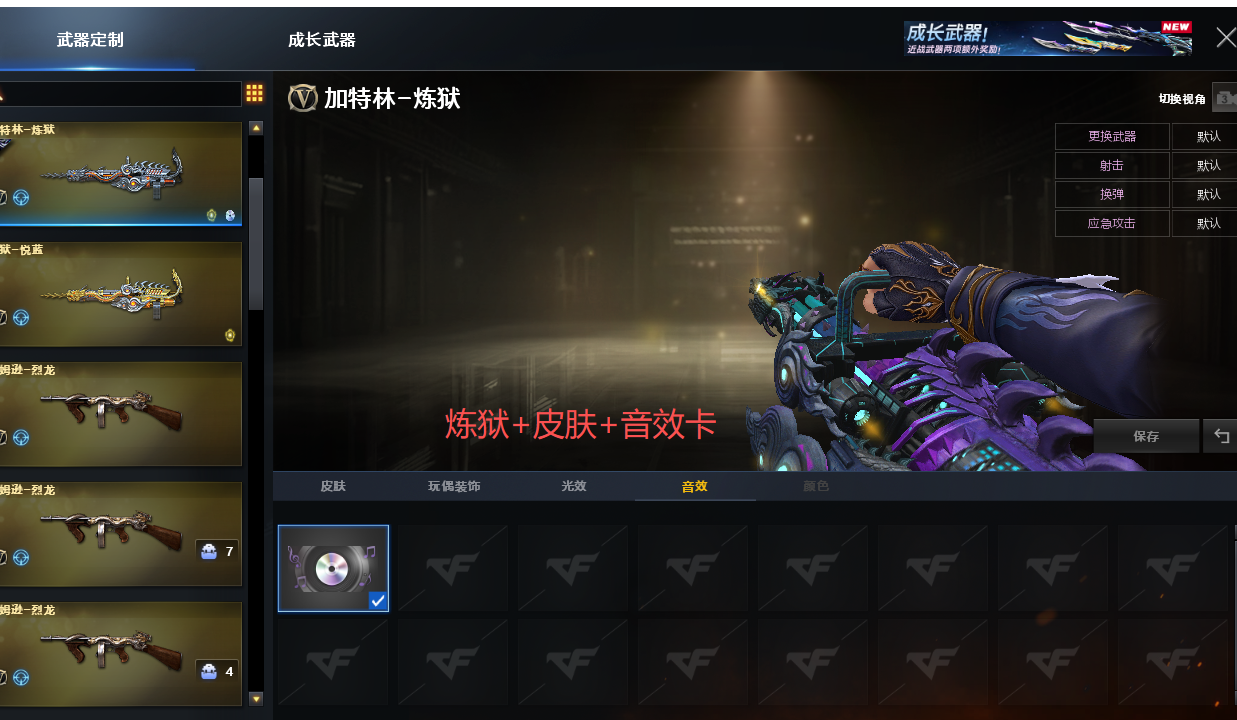 音效卡:炼狱-百战金芒-庆典舞曲音效卡、HK417-朱雀-电竞之星-竞星跃动音效卡、修罗-云海游龙音效卡、加特林-炼狱音效卡、M4A1-黑龙音效卡、Barrett-毁灭音效卡、AWM-裁决音效卡、AK47-火麒麟音效卡、屠龙-电竞之星-竞星跃动音效卡