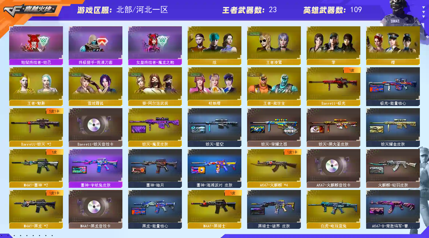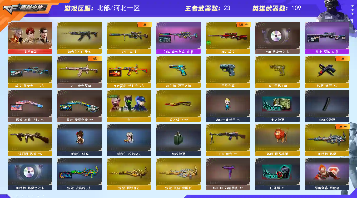 英雄主武:M200-幻神、Barrett-毁灭、Barrett-极光、Barrett-暗月传说、barrett-金色蔷薇、AWM-裁决、AWM-天龙、白虎-电玩蓝兔、QBZ03-金色蔷薇、M4A1-雷神、M4A1-黑骑士、M4A1-黑龙、M4A1-雷霆、M4A1-青龙、M4A1-武圣、AK47-火麒麟、AK47-黑鲨、无影-神兵利器、AK47-B-身先士卒、AK47-B-战士、AK47-B-常胜将军、AK12-天启、汤姆逊-烈龙、加特林-炼狱、RPK-盘龙、金色蔷薇-古蛇迷踪、炼狱-百战金芒、机械迷城-穹宇、加利尔ACE-天袭、天罚-斗烈龙驹
