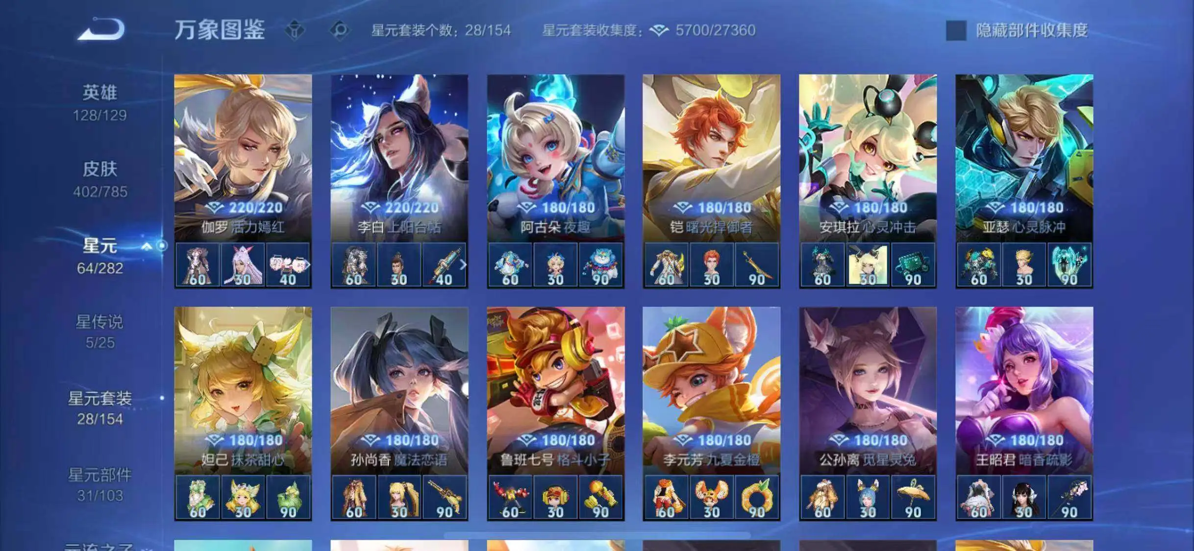 【荣耀典藏】:武则天英雄,孙悟空全息碎影,武则天倪克斯神谕,夏侯惇无限飓风号,小乔天鹅之梦,孙尚香杀手不太冷,鲁班七号星空梦想,芈月大秦宣太后,李白鸣剑曳影,诸葛亮星域神启