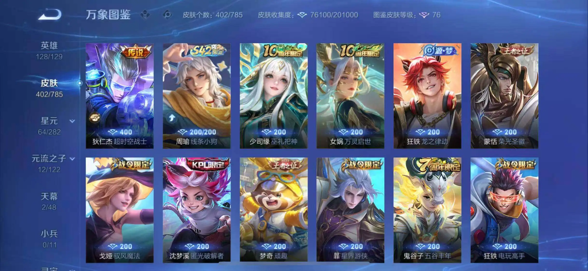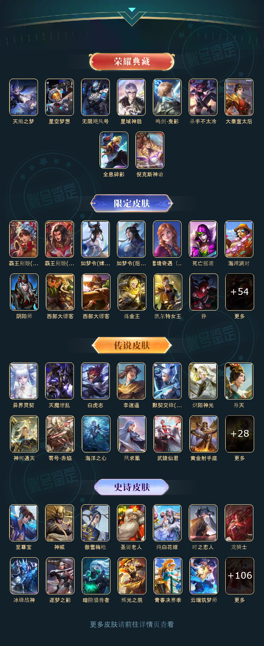 【史诗皮肤】:周瑜线条小狗,少司缘巫礼祀神,女娲万灵启世,狂铁龙之律动,蒙恬荣光圣徽,戈娅驭风魔法,沈梦溪匿光破解者,暃星界游侠,梦奇顽趣,鬼谷子五谷丰年,狂铁电玩高手,艾琳奇遇舞章,夏洛特永昼,廉颇寅虎御盾,杨玉环寅虎心曲,韩信傲雪梅枪,甄姬女儿国国王,雅典娜黎明之约,黄忠火炮绅士,嫦娥拒霜思,司马懿暗渊魔法,庄周高山流水,猪八戒猪悟能,钟馗乐园奇幻夜,沈梦溪月团寄思,干将莫邪真爱魔法,杨戬天秀启明,老夫子航海奇遇记,蒙犽龙鼓争鸣,百里玄策热力回旋,西施诗语江南,米莱狄胡桃异想国,花木兰默契交锋,吕布御风骁将,芈月白晶晶,元歌云间偶戏,孙膑天狼运算者,云中君纤云弄巧,裴擒虎李小龙,百里玄策原初追逐者,蒙犽狂想玩偶喵,马可波罗暗影游猎,上官婉儿天狼绘梦者,孙尚香时之恋人,瑶遇见神鹿,马超神威,橘右京修罗,阿轲迷踪丽影,不知火舞魅语,小乔青蛇,大乔白蛇,后羿如梦令,嫦娥如梦令,韩信飞衡,娜可露露晚萤,李元芳银河之约,蔡文姬繁星吟游,上官婉儿梁祝,兰陵王驯魔猎人,公孙离无限星赏官,狄仁杰鹰眼统帅,鲁班七号狮舞东方,伽罗箭羽风息,典韦蓝屏警告,孙悟空大圣娶亲,露娜一生所爱,干将莫邪冰霜恋舞曲,大乔猫狗日记,孙策猫狗日记,嬴政白昼王子,蔡文姬奇迹圣诞,杨玉环遇见飞天,阿轲节奏热浪,白起星夜王子,程咬金功夫厨神,李元芳逐浪之夏,刘禅天才门将,蔡文姬舞动绿茵,铠曙光守护者,百里守约特工魅影,花木兰青春决赛季,庄周云端筑梦师,后羿辉光之辰,安琪拉心灵骇客,雅典娜冰冠公主,亚瑟心灵战警,甄姬游园惊梦,诸葛亮黄金分割率,兰陵王暗隐猎兽者,小乔缤纷独角兽,夏侯惇乘风破浪,韩信逐梦之影,刘邦德古拉伯爵,花木兰水晶猎龙者,孙悟空至尊宝,关羽冰锋战神,虞姬霸王别姬,项羽霸王别姬,韩信白龙吟,张飞乱世虎臣,吕布末日机甲,李白千年之狐,曹操幽灵船长,小乔纯白花嫁,刘禅绅士熊喵,吕布圣诞狂欢,墨子金属风暴,墨子龙骑士,妲己女仆咖啡,妲己魅力维加斯,嬴政摇滚巨星,嬴政暗夜贵公子,嬴政优雅恋人,孙尚香水果甜心,宫本武藏鬼剑武藏,廉颇地狱岩魂,狄仁杰魔术师,王昭君偶像歌手,甄姬冰雪圆舞曲,老夫子圣诞老人,貂蝉圣诞恋歌,赵云未来纪元,赵云皇家上将,阿轲暗夜猫娘,露娜紫霞仙子,项羽苍穹之光,鲁班七号电玩小子