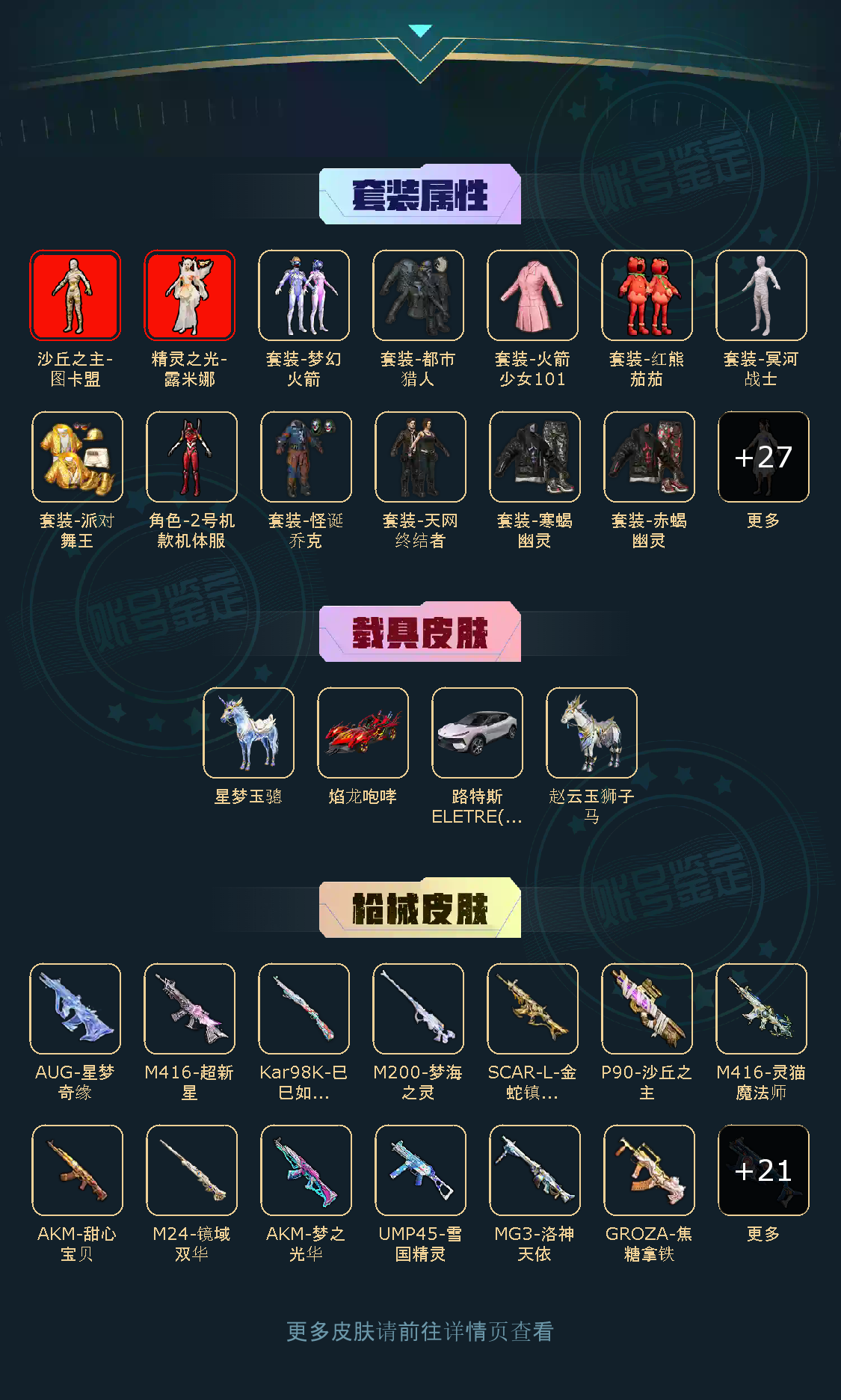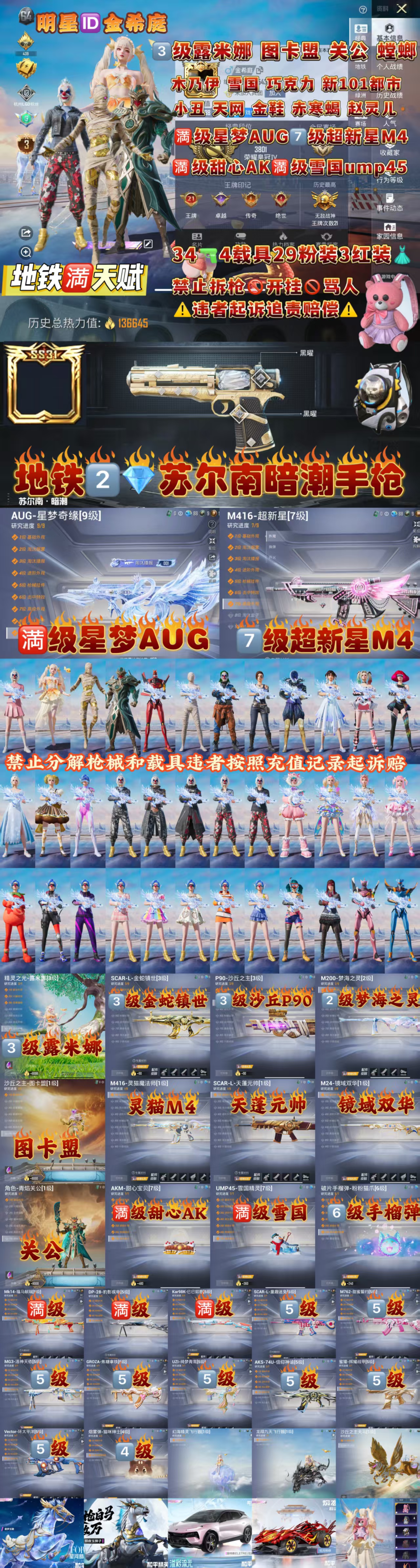 32粉,4载具,223套装,21王牌印记,无敌战神历史最高段,136645热力值 M416-灵猫魔法师/AKM-甜心宝贝/SCAR-L-童趣迷兔/AUG-星梦奇缘/AUG-星之彼岸/M416-暖熊萌萌/SCAR-L-天蓬元帅/M416-心之恋语/M416-五爪金龙/GROZA-焦糖拿铁/SCAR-L-青春物语/SCAR-L-金蛇镇世/M762-甜蜜誓约/M416-超新星/蜜獾-辉耀战甲/AKM-梦之光华/M417-第五大道/Mk14-福马献瑞/MG3-洛神天依/DP-28-豹影疾电/UZI-绮梦青鸾/AKS-74U-信仰神谕/Vector-灵感创作师/Vector-环太平洋/UMP45-雪国精灵/UMP45-相思残雪/P90-沙丘之主/汤姆逊-冰川粉黛/烟雾弹-猫咪绅士/破片手榴弹-粉粉猫爪/AWM-花间之火/Kar98K-巳巳如意/M24-镜域双华/M200-梦海之灵/路特斯ELETRE(花绽灰)/焰龙咆哮/星梦玉骢/赵云玉狮子马/照夜玉狮子/